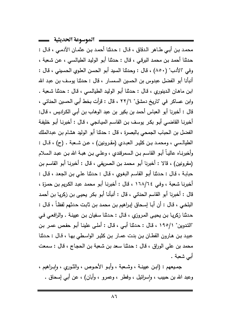 محمد بن أبي طاهر الدقاق، قال: حدثنا أحمد بن عثمان الآدمي، قال: حدثنا أحمد بن محمد البرقي، قال: حدثنا أبو الوليد الطيالسي، عن شعبة، وفي "الأدب" (٨٥٠)، قال: وحدثنا السيد أبو الحسن العلوي الحسيني، قال: أنبأنا أبو الفضل عبدوس بن الحسين السمسار، قال: حدثنا يوسف بن عبد الله بن ماهان الدينوري، قال: حدثنا أبو الوليد الطيالسي، قال: حدثنا شعبة. وابن عساكر في "تاريخ دمشق" ٦/ ٢٢، قال: قرأت بخط أبي الحسين الحنائي، قال: أخبرنا أبو العباس أحمد بن بكير بن عبد الوهاب بن أبي الكراديس، قال: أخبرنا القاضي أبو بكر يوسف بن القاسم الميانجي، قال: أخبرنا أبو خليفة الفضل بن الحباب الجمحي بالبصرة، قال: حدثنا أبو الوليد هشام بن عبد الملك الطيالسي، ومحمد بن كثير العبدي (مقرونين)، عن شعبة. (ح)، قال: وأخبرناه عاليًا أبو القاسم بن السمرقندي، وعلي بن هبة الله بن عبد السلام (مقرونين)، قالا: أخبرنا أبو محمد بن الصريفي، قال: أخبرنا أبو القاسم بن حبابة، قال: حدثنا أبو القاسم البغوي، قال: حدثنا علي بن الجعد، قال: أخبرنا شعبة، وفي ٦٤/ ١٦٨، قال: أخبرنا أبو محمد عبد الكريم بن حمزة، قال: أخبرنا أبو القاسم الحنائي، قال: أنبأنا أبو بكر يحيى بن زكريا بن أحمد البلخي، قال: أن أبا إسحاق إبراهيم بن محمد بن ثابت حدثهحم لفظًا، قال: حدثنا زكريا بن يحيى المروزي، قال: حدثنا سفيان بن عيينة. والرافعي في "التدوين" ١/ ١٩٥، قال: حدثنا أبي، قال: أملى علينا أبو حفص عمر بن عبيد بن هارون القطان بن بنت عمار بن كثير الواسطي بها، قال: حدثنا محمد بن علي الوراق، قال: حدثنا سعد بن شعبة بن الحجاج، قال: سمعت أبي شعبة.