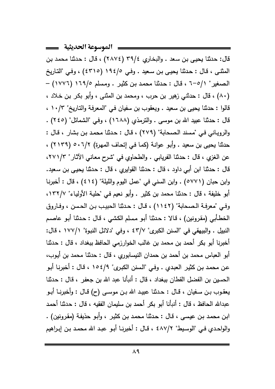 قال: حدثنا يحيى بن سعد. والبخاري ٤/ ٣٩ (٢٨٧٤)، قال: حدثنا محمد بن المثنى، قال: حدثنا يحيى بن سعيد. وفي ٥/ ١٩٤ (٤٣١٥)، وفي "التاريخ الصغير" ١/ ٥ - ٦، قال: حدثنا محمد بن كثير. ومسلم ٥/ ١٦٩ (١٧٧٦) - (٨٠)، قال: حدثني زهير بن حرب، ومحمد بن المثنى، وأبو بكر بن خلاد، قالوا: حدثنا يحيى بن سعيد. ويعقوب بن سفيان في "المعرفة والتاريخ" ٣/ ١٠، قال: حدثنا عبيد الله بن موسى. والترمذي (١٦٨٨)، وفي "الشمائل" (٢٤٥). والروياني في "مسند الصحابة" (٢٧٩)، قال: حدثنا محمد بن بشار، قال: حدثنا يحيى بن سعيد. وأبو عوانة (كما في إتحاف المهرة) ٢/ ٥٠٦ (٢١٣٩)، عن الغزي، قال: حدثنا الفريابي. والطحاوي في "شرح معاني الآثار" ٣/ ٢٧١، قال: حدثنا ابن أبي داود، قال: حدثنا القوايري، قال: حدثنا يحيى بن سعيد. وابن حبان (٥٧٧١). وابن السني في "عمل اليوم والليلة" (٤١٤)، قال: أخبرنا أبو خليفة، قال: حدثنا محمد بن كثير. وأبو نعيم في "حلية الأولياء" ٧/ ١٣٢، وفي "معرفة الصحابة" (١١٤٢)، قال: حدثنا الحبيب بن الحسن، وفاروق الخطابي (مقرونين)، قالا: حدثنا أبو مسلم الكشي، قال: حدثنا أبو عاصم النبيل. والبيهقي في "السنن الكبرى" ٧/ ٤٣، وفي "دلائل النبوة" ١/ ١٧٧، قال: أخبرنا أبو بكر أحمد بن محمد بن غالب الخوارزمي الحافظ ببغداد، قال: حدثنا أبو العباس محمد بن أحمد بن حمدان النيسابوري، قال: حدثنا محمد بن أيوب، عن محمد بن كثير العبدي. وفي "السنن الكبرى" ٩/ ١٥٤، قال: أخبرنا أبو الحسين بن الفضل القطان ببغداد، قال: أنبأنا عبد الله بن جعفر، قال: حدثنا يعقوب بن سفيان، قال: حدثنا عبيد الله بن موسى (ح) قال: وأخبرنا أبو عبد الله الحافظ، قال: أنبأنا أبو بكر أحمد بن سليمان الفقيه، قال: حدثنا أحمد بن محمد بن عيسى، قال: حدثنا محمد بن كثير، وأبو حذيفة (مقرونين). والواحدي في "الوسيط" ٢/ ٤٨٧، قال: أخبرنا أبو عبد الله محمد بن إبراهيم