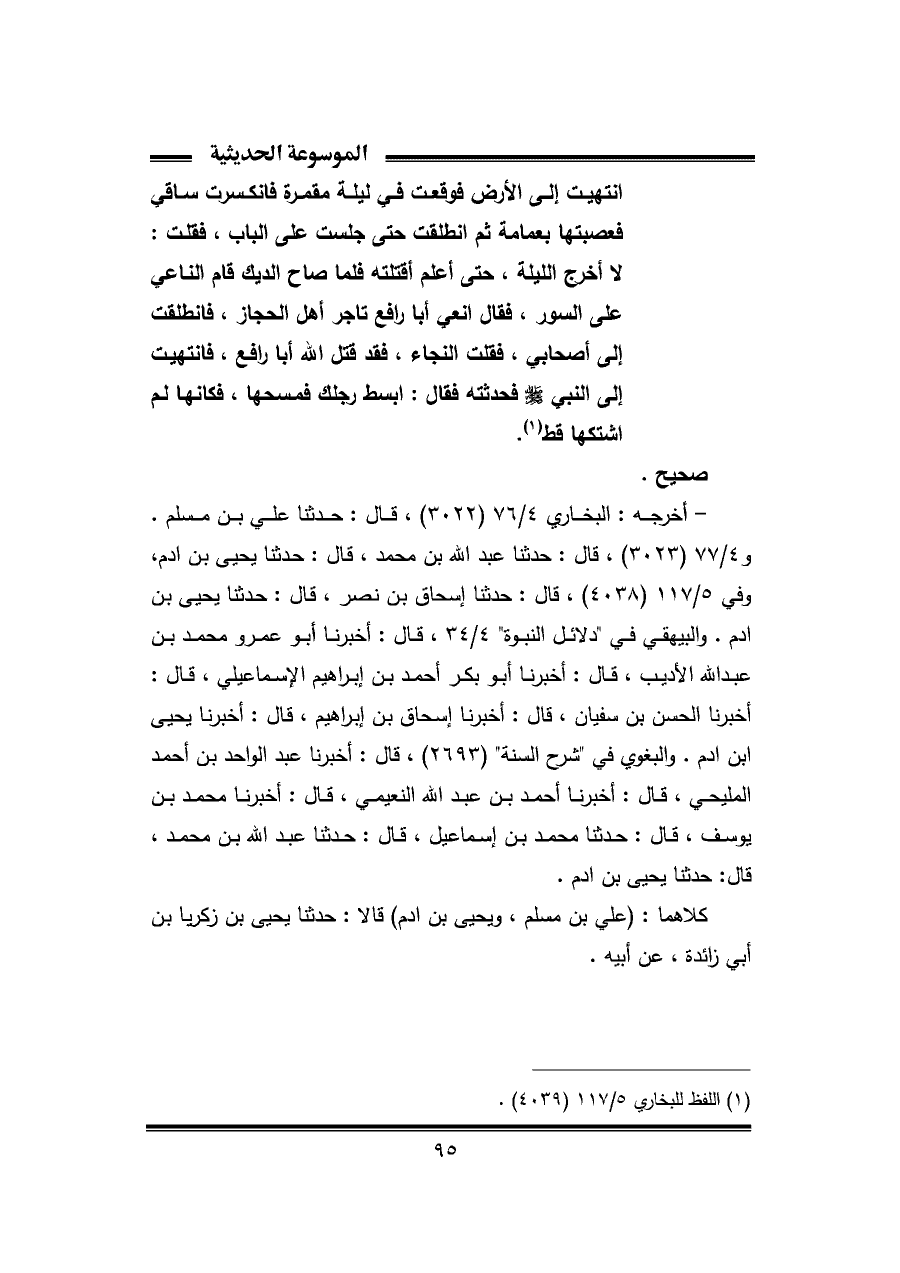انتهيت إلى الأرض فوقعت في ليلة مقمرة فانكسرت ساقي فعصبتها بعمامة ثم انطلقت حتى جلست على الباب، فقلت: لا أخرج الليلة، حتى أعلم أقتلته فلما صاح الديك قام الناعي على السور، فقال أنعي أبا رافع تاجر أهل الحجاز، فانطلقت إلى أصحابي، فقلت النجاء، فقد قتل الله أبا رافع، فانتهيت إلى النبي - صلى الله عليه وسلم - فحدثته فقال: ابسط رجلك فمسحها، فكأنها لم أشتكها قط (¬١).
