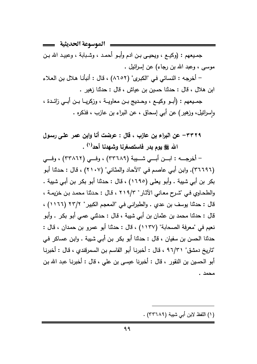 ٣٣٢٩ - عن البراء بن عازب، قال: عرضت أنا وابن عمر على رسول الله - صلى الله عليه وسلم - يوم بدر فاستصغرنا وشهدنا أحد (¬١).