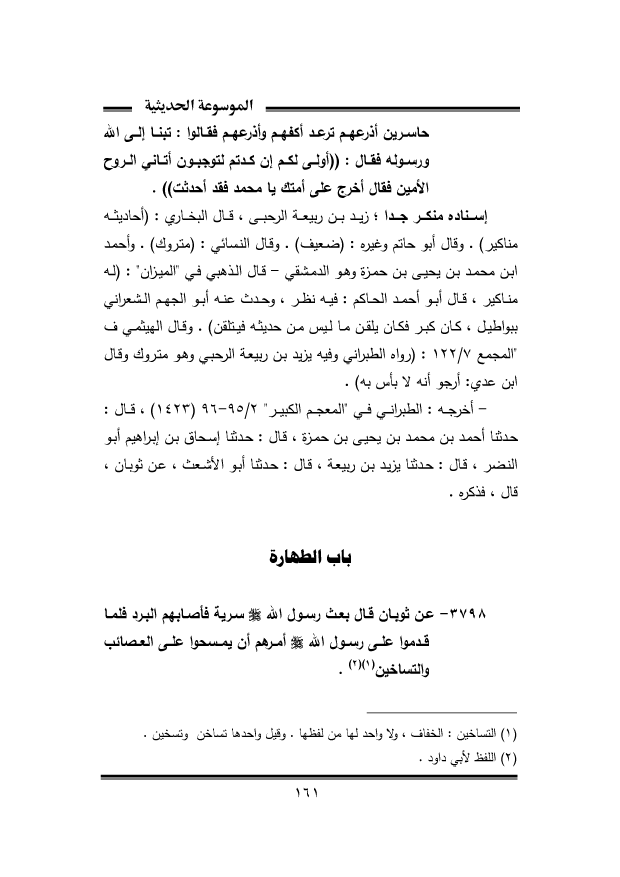 ٣٧٩٨ - عن ثوبان قال بعث رسول اللّه - صلى الله عليه وسلم - سرية فأصابهم البرد فلما قدموا على رسول اللّه - صلى الله عليه وسلم - أمرهم أن يمسحوا على العصائب والتساخين (¬١) (¬٢).