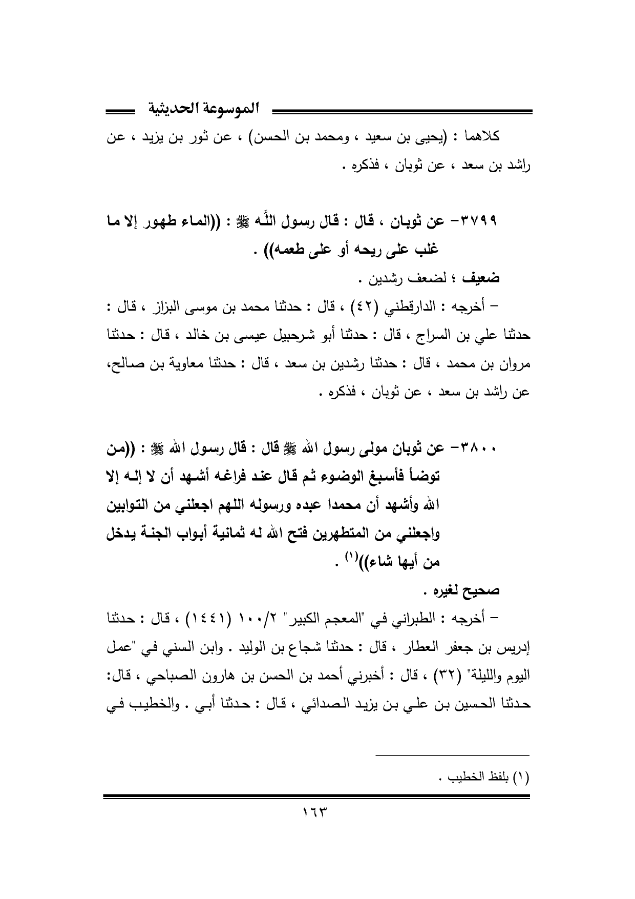 - أخرجه: الدارقطني (٤٢)، قال: حدثنا محمد بن موسى البزاز، قال: حدثنا علي بن السراج، قال: حدثنا أبو شرحبيل عيسى بن خالد، قال: حدثنا مروان بن محمد، قال: حدثنا رشدين بن سعد، قال: حدثنا معاوية بن صالح، عن راشد بن سعد، عن ثوبان، فذكره.