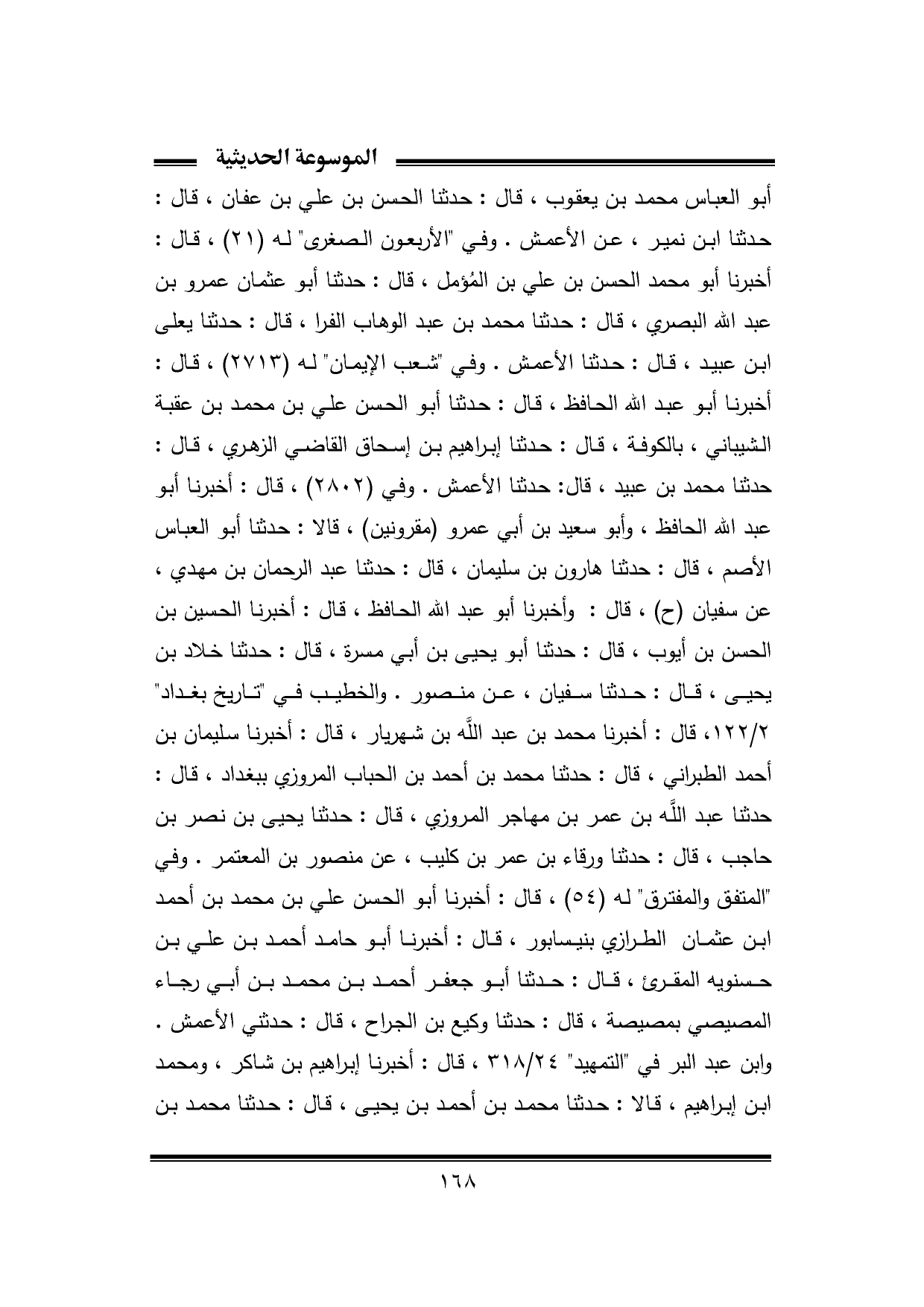 أبو العباس محمد بن يعقوب، قال: حدثنا الحسن بن علي بن عفان، قال: حدثنا ابن نمير، عن الأعمش. وفي "الأربعون الصغرى" له (٢١)، قال: أخبرنا أبو محمد الحسن بن علي بن المُؤمل، قال: حدثنا أبو عثمان عمرو بن عبد الله البصري، قال: حدثنا محمد بن عبد الوهاب الفرا، قال: حدثنا يعلى بن عبيد، قال: حدثنا الأعمش. وفي "شعب الإيمان" له (٢٧١٣)، قال: أخبرنا أبو عبد الله الحافظ، قال: حدثنا أبو الحسن علي بن محمد بن عقبة الشيباني، بالكوفة، قال: حدثنا إبراهيم بن إسحاق القاضي الزهري، قال: حدثنا محمد بن عبيد، قال: حدثنا الأعمش. وفي (٢٨٠٢)، قال: أخبرنا أبو عبد الله الحافظ، وأبو سعيد بن أبي عمرو (مقرونين)، قالا: حدثنا أبو العباس الأصم، قال: حدثنا هارون بن سليمان، قال: حدثنا عبد الرحمان بن مهدي، عن سفيان (ح)، قال: وأخبرنا أبو عبد الله الحافظ، قال: أخبرنا الحسين بن الحسن بن أيوب، قال: حدثنا أبو يحيى بن أبي مسرة، قال: حدثنا خلاد بن يحيى، قال: حدثنا سفيان، عن منصور. والخطيب في "تاريخ بغداد" ٢/ ١٢٢، قال: أخبرنا محمد بن عبد اللَّه بن شهريار، قال: أخبرنا سليمان بن أحمد الطبراني، قال: حدثنا محمد بن أحمد بن الحباب المروزي ببغداد، قال: حدثنا عبد اللَّه بن عمر بن مهاجر المروزي، قال: حدثنا يحيى بن نصر بن حاجب، قال: حدثنا ورقاء بن عمر بن كليب، عن منصور بن المعتمر. وفي "المتفق والمفترق" له (٥٤)، قال: أخبرنا أبو الحسن علي بن محمد بن أحمد بن عثمان الطرازي بنيسابور، قال: أخبرنا أبو حامد أحمد بن علي بن حسنويه المقرئ، قال: حدثنا أبو جعفر أحمد بن محمد بن أبي رجاء المصيصي بمصيصة، قال: حدثنا وكيع بن الجراح، قال: حدثني الأعمش. وابن عبد البر في "التمهيد" ٢٤/ ٣١٨، قال: أخبرنا إبراهيم بن شاكر، ومحمد بن إبراهيم، قالا: حدثنا محمد بن أحمد بن يحيى، قال: حدثنا محمد بن