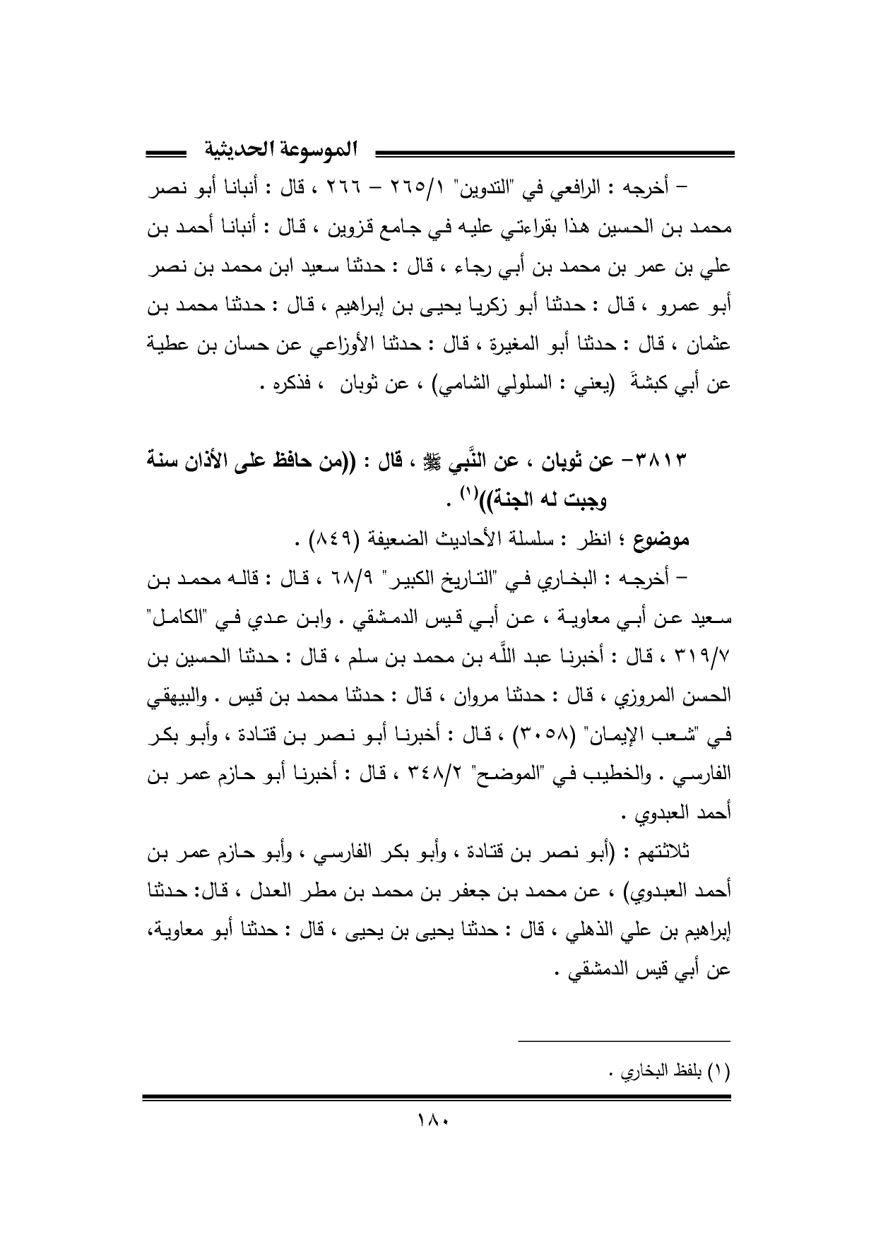 ٣٨١٣ - عن ثوبان، عن النَّبي - صلى الله عليه وسلم -، قال: "من حافظ على الأذان سنة وجبت له الجنة" (¬١).