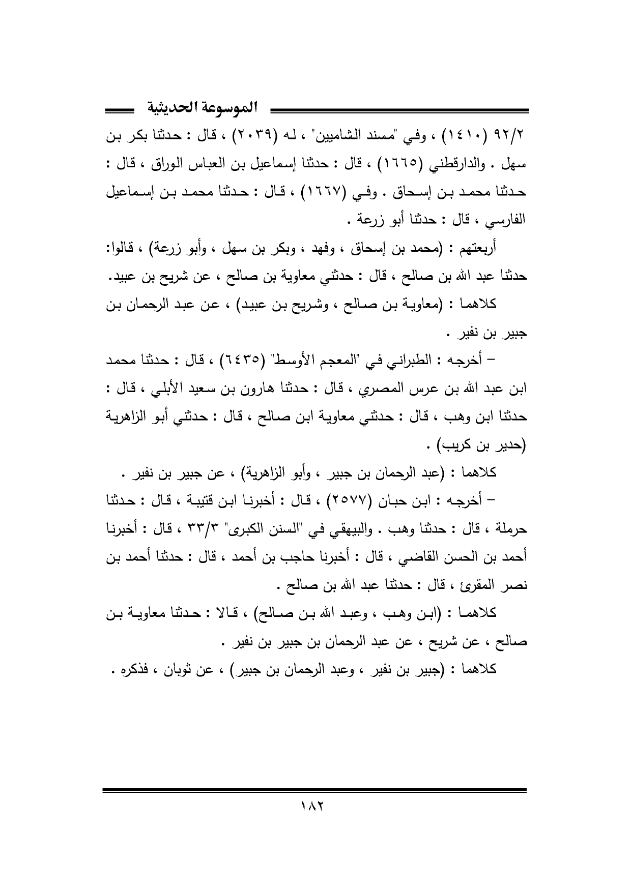 كلاهما: (ابن وهب، وعبد الله بن صالح)، قالا: حدثنا معاوية بن صالح، عن شريح، عن عبد الرحمان بن جبير بن نفير.
