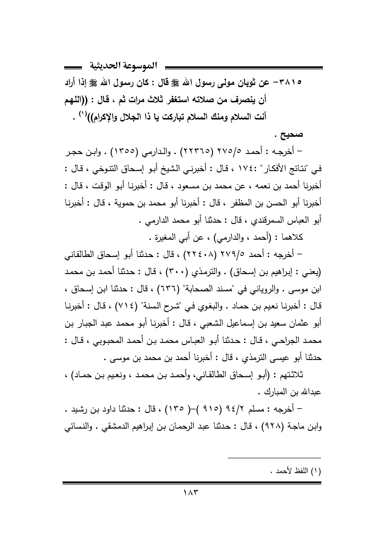 ٣٨١٥ - عن ثوبان مولى رسول الله - صلى الله عليه وسلم - قال: كان رسول الله - صلى الله عليه وسلم - إذا أراد أن ينصرف من صلاته استغفر ثلاث مرات ثم، قال: "اللهم أنت السلام ومنك السلام تباركت يا ذا الجلال والإكرام" (¬١).