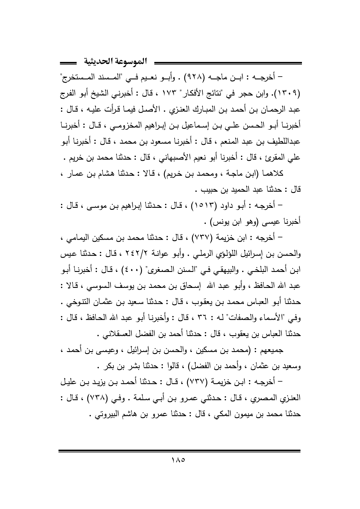 - أخرجه: ابن ماجه (٩٢٨). وأبو نعيم في "المسند المستخرج" (١٣٠٩). وابن حجر في "نتائج الأفكار" ١٧٣، قال: أخبرني الشيخ أبو الفرج عبد الرحمان بن أحمد بن المبارك العنزي. الأصل فيما قرأت عليه، قال: أخبرنا أبو الحسن علي بن إسماعيل بن إبراهيم المخزومي، قال: أخبرنا عبد اللطيف بن عبد المنعم، قال: أخبرنا مسعود بن محمد، قال: أخبرنا أبو علي المقرئ، قال: أخبرنا أبو نعيم الأصبهاني، قال: حدثنا محمد بن خريم.
