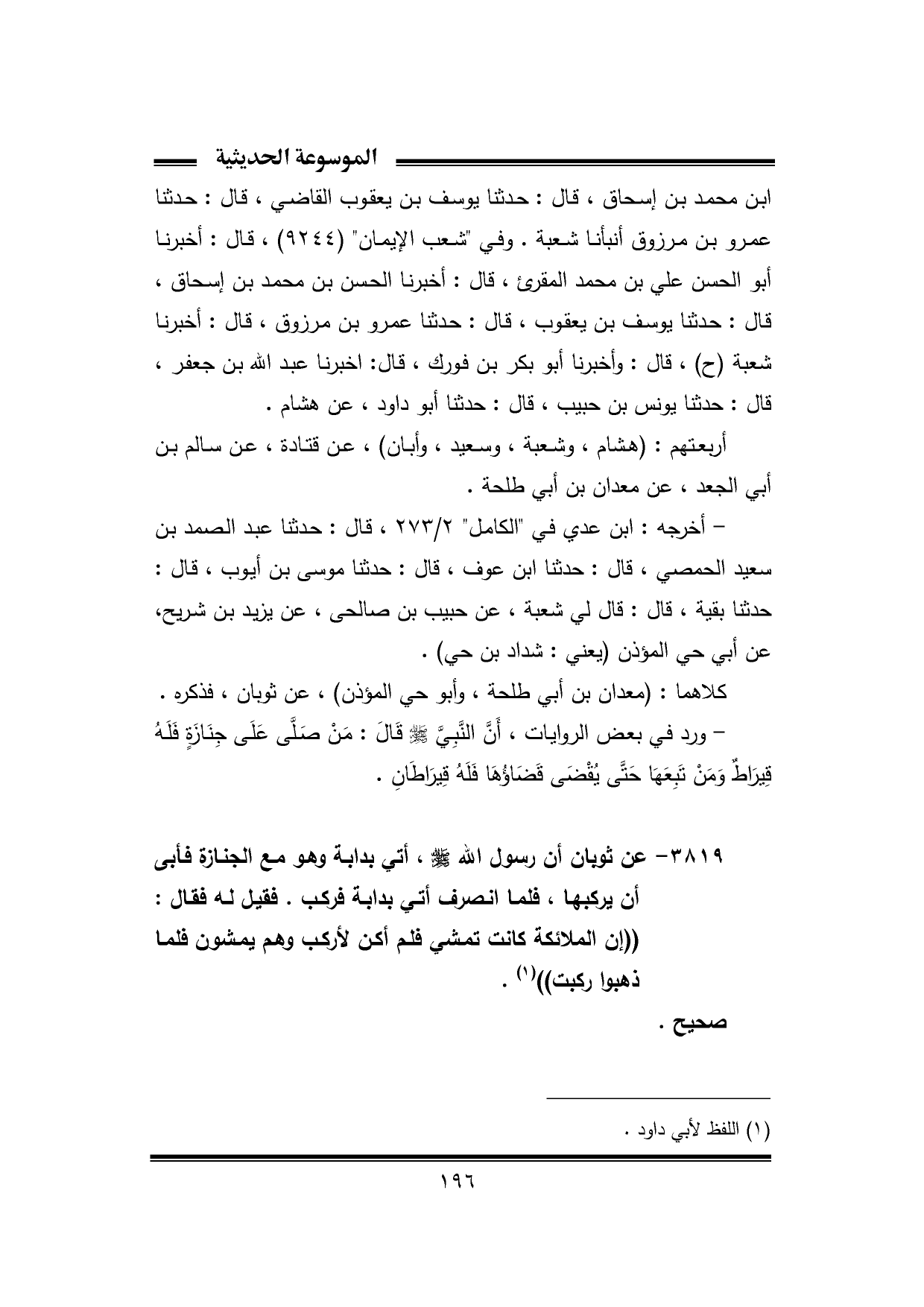 ٣٨١٩ - عن ثوبان أن رسول الله - صلى الله عليه وسلم -، أتي بدابة وهو مع الجنازة فأبى أن يركبها، فلما انصرف أتي بدابة فركب. فقيل له فقال: "إن الملائكة كانت تمشي فلم أكن لأركب وهم يمشون فلما ذهبوا ركبت" (¬١).