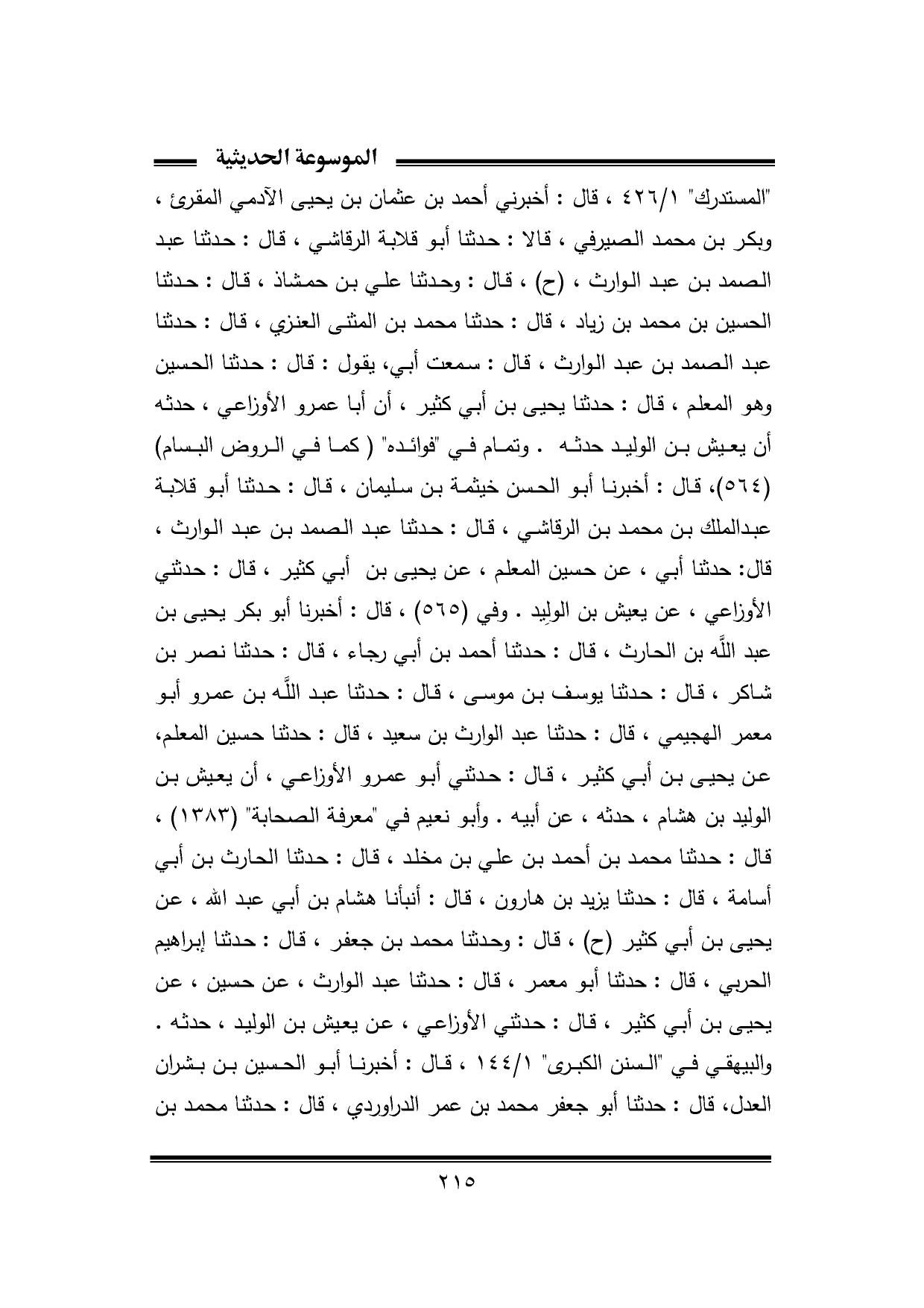 "المستدرك" ١/ ٤٢٦، قال: أخبرني أحمد بن عثمان بن يحيى الآدمي المقرئ، وبكر بن محمد الصيرفي، قالا: حدثنا أبو قلابة الرقاشي، قال: حدثنا عبد الصمد بن عبد الوارث، (ح)، قال: وحدثنا علي بن حمشاذ، قال: حدثنا الحسين بن محمد بن زياد، قال: حدثنا محمد بن المثنى العنزي، قال: حدثنا عبد الصمد بن عبد الوارث، قال: سمعت أبي، يقول: قال: حدثنا الحسين وهو المعلم، قال: حدثنا يحيى بن أبي كثير، أن أبا عمرو الأوزاعي، حدثه أن يعيش بن الوليد حدثه. وتمام في "فوائده" (كما في الروض البسام) (٥٦٤)، قال: أخبرنا أبو الحسن خيثمة بن سليمان، قال: حدثنا أبو قلابة عبد الملك بن محمد بن الرقاشي، قال: حدثنا عبد الصمد بن عبد الوارث، قال: حدثنا أبي، عن حسين المعلم، عن يحيى بن أبي كثير، قال: حدثني الأوزاعي، عن يعيش بن الولِيد. وفي (٥٦٥)، قال: أخبرنا أبو بكر يحيى بن عبد اللَّه بن الحارث، قال: حدثنا أحمد بن أبي رجاء، قال: حدثنا نصر بن شاكر، قال: حدثنا يوسف بن موسى، قال: حدثنا عبد اللَّه بن عمرو أبو معمر الهجيمي، قال: حدثنا عبد الوارث بن سعيد، قال: حدثنا حسين المعلم، عن يحيى بن أبي كثير، قال: حدثني أبو عمرو الأوزاعي، أن يعيش بن الوليد بن هشام، حدثه، عن أبيه. وأبو نعيم في "معرفة الصحابة" (١٣٨٣)، قال: حدثنا محمد بن أحمد بن علي بن مخلد، قال: حدثنا الحارث بن أبي أسامة، قال: حدثنا يزيد بن هارون، قال: أنبأنا هشام بن أبي عبد الله، عن يحيى بن أبي كثير (ح)، قال: وحدثنا محمد بن جعفر، قال: حدثنا إبراهيم الحربي، قال: حدثنا أبو معمر، قال: حدثنا عبد الوارث، عن حسين، عن يحيى بن أبي كثير، قال: حدثني الأوزاعي، عن يعيش بن الوليد، حدثه. والبيهقي في "السنن الكبرى" ١/ ١٤٤، قال: أخبرنا أبو الحسين بن بشران العدل، قال: حدثنا أبو جعفر محمد بن عمر الدراوردي، قال: حدثنا محمد بن
