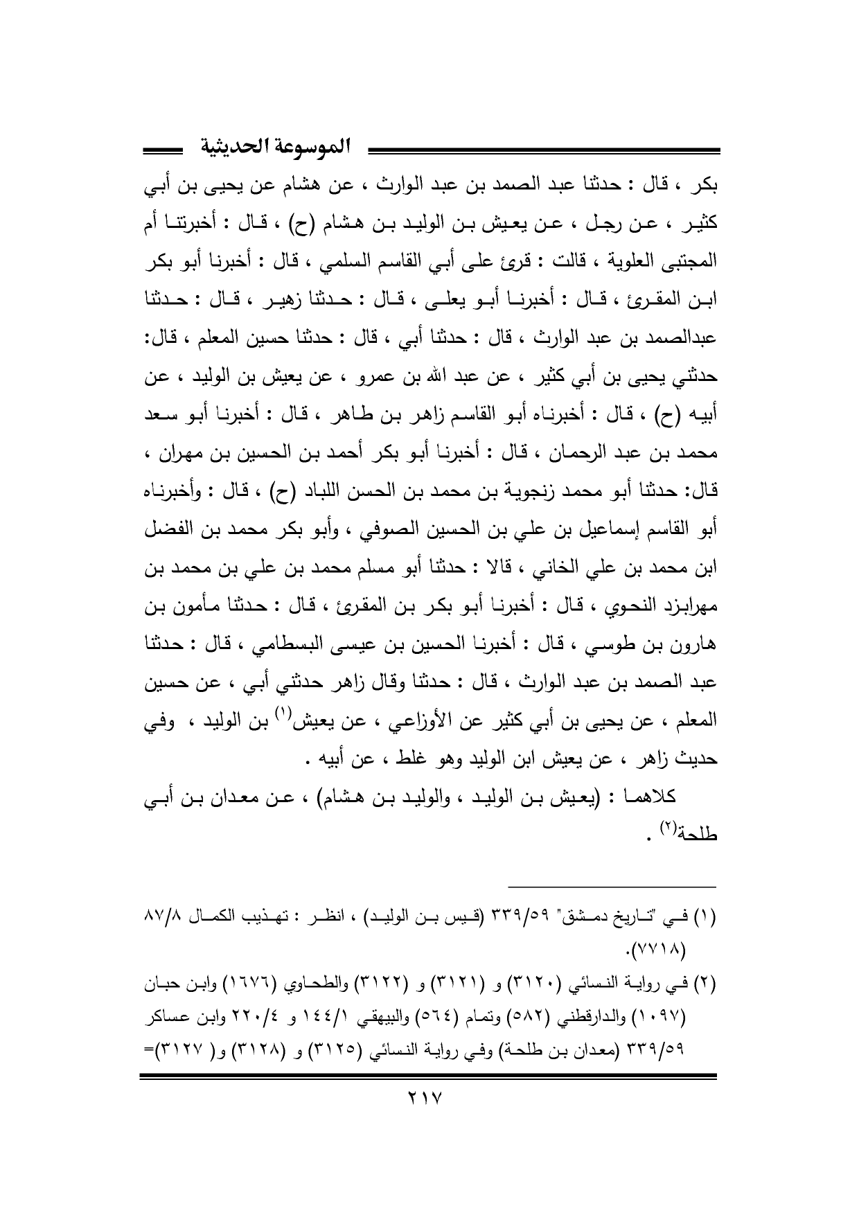 بكر، قال: حدثنا عبد الصمد بن عبد الوارث، عن هشام عن يحيى بن أبي كثير، عن رجل، عن يعيش بن الوليد بن هشام (ح)، قال: أخبرتنا أم المجتبى العلوية، قالت: قرئ على أبي القاسم السلمي، قال: أخبرنا أبو بكر بن المقرئ، قال: أخبرنا أبو يعلى، قال: حدثنا زهير، قال: حدثنا عبد الصمد بن عبد الوارث، قال: حدثنا أبي، قال: حدثنا حسين المعلم، قال: حدثني يحيى بن أبي كثير، عن عبد الله بن عمرو، عن يعيش بن الوليد، عن أبيه (ح)، قال: أخبرناه أبو القاسم زاهر بن طاهر، قال: أخبرنا أبو سعد محمد بن عبد الرحمان، قال: أخبرنا أبو بكر أحمد بن الحسين بن مهران، قال: حدثنا أبو محمد زنجوية بن محمد بن الحسن اللباد (ح)، قال: وأخبرناه أبو القاسم إسماعيل بن علي بن الحسين الصوفي، وأبو بكر محمد بن الفضل بن محمد بن علي الخاني، قالا: حدثنا أبو مسلم محمد بن علي بن محمد بن مهرابزد النحوي، قال: أخبرنا أبو بكر بن المقرئ، قال: حدثنا مأمون بن هارون بن طوسي، قال: أخبرنا الحسين بن عيسى البسطامي، قال: حدثنا عبد الصمد بن عبد الوارث، قال: حدثنا وقال زاهر حدثني أبي، عن حسين المعلم، عن يحيى بن أبي كثير عن الأوزاعي، عن يعيش (¬١) بن الوليد، وفي حديث زاهر، عن يعيش بن الوليد وهو غلط، عن أبيه.
