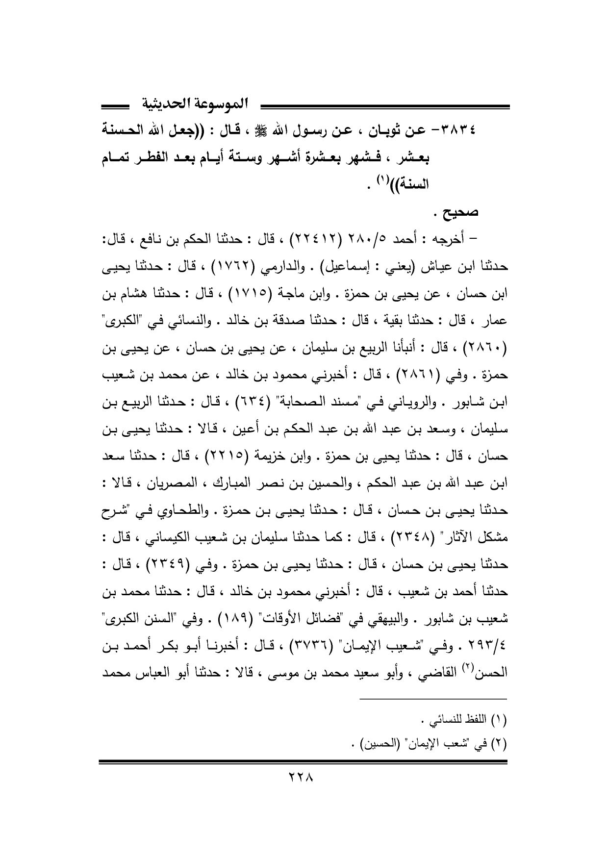 ٣٨٣٤ - عن ثوبان، عن رسول الله - صلى الله عليه وسلم -، قال: "جعل الله الحسنة بعشر، فشهر بعشرة أشهر وستة أيام بعد الفطر تمام السنة" (¬١).