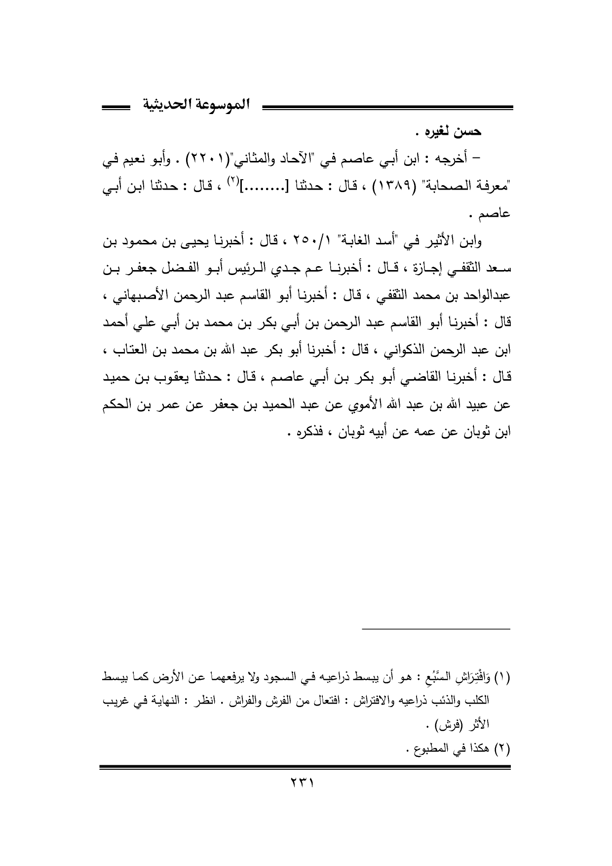وابن الأثير في "أسد الغابة" ١/ ٢٥٠، قال: أخبرنا يحيى بن محمود بن سعد الثقفي إجازة، قال: أخبرنا عم جدي الرئيس أبو الفضل جعفر بن عبد الواحد بن محمد الثقفي، قال: أخبرنا أبو القاسم عبد الرحمن الأصبهاني، قال: أخبرنا أبو القاسم عبد الرحمن بن أبي بكر بن محمد بن أبي علي أحمد بن عبد الرحمن الذكواني، قال: أخبرنا أبو بكر عبد الله بن محمد بن العتاب، قال: أخبرنا القاضي أبو بكر بن أبي عاصم، قال: حدثنا يعقوب بن حميد عن عبيد الله بن عبد الله الأموي عن عبد الحميد بن جعفر عن عمر بن الحكم بن ثوبان عن عمه عن أبيه ثوبان، فذكره.