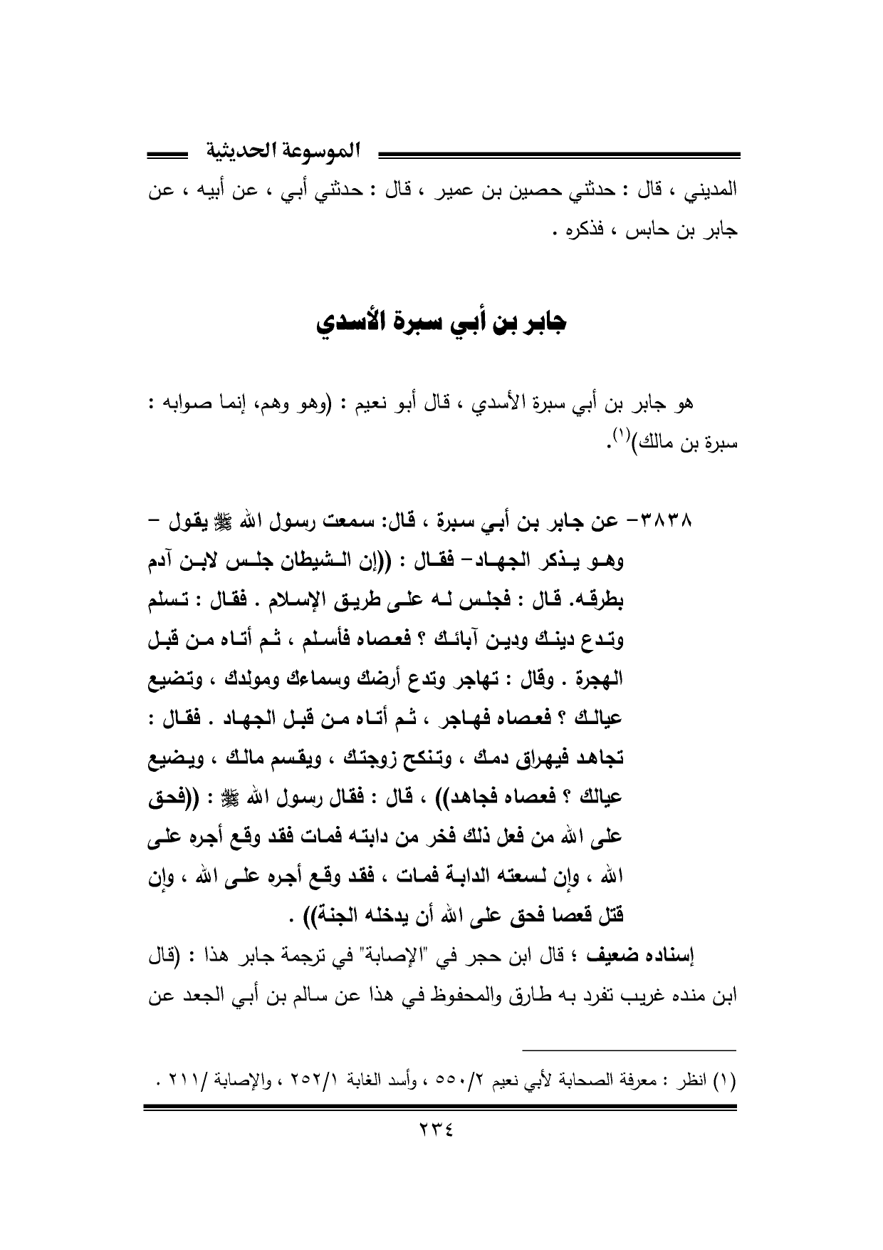 ٣٨٣٨ - عن جابر بن أبي سبرة، قال: سمعت رسول الله - صلى الله عليه وسلم - يقول - وهو يذكر الجهاد - فقال: "إن الشيطان جلس لابن آدم بطرقه. قال: فجلس له على طريق الإسلام. فقال: تسلم وتدع دينك ودين آبائك؟ فعصاه فأسلم، ثم أتاه من قبل الهجرة. وقال: تهاجر وتدع أرضك وسماءك ومولدك، وتضيع عيالك؟ فعصاه فهاجر، ثم أتاه من قبل الجهاد. فقال: تجاهد فيهراق دمك، وتنكح زوجتك، ويقسم مالك، ويضيع عيالك؟ فعصاه فجاهد"، قال: فقال رسول الله - صلى الله عليه وسلم -: "فحق على الله من فعل ذلك فخر من دابته فمات فقد وقع أجره على الله، وإن لسعته الدابة فمات، فقد وقع أجره على الله، وإن قتل قعصا فحق على الله أن يدخله الجنة".