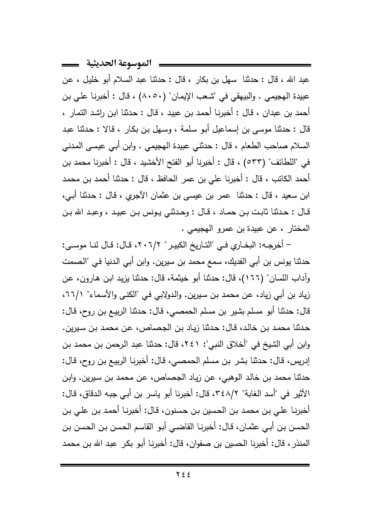 عبد الله، قال: حدثنا سهل بن بكار، قال: حدثنا عبد السلام أبو خليل، عن عبيدة الهجيمي. والبيهقي في "شعب الإيمان" (٨٠٥٠)، قال: أخبرنا علي بن أحمد بن عبدان، قال: أخبرنا أحمد بن عبيد، قال: حدثنا ابن راشد التمار، قال: حدثنا موسى بن إسماعيل أبو سلمة، وسهل بن بكار، قالا: حدثنا عبد السلام صاحب الطعام، قال: حدثني عبيدة الهجيمي. وابن أبي عيسى المدني في "اللطائف" (٥٣٣)، قال: أخبرنا أبو الفتح الأخشيد، قال: أخبرنا محمد بن أحمد الكاتب، قال: أخبرنا علي بن عمر الحافظ، قال: حدثنا أحمد بن محمد بن سعيد، قال: حدثنا عمر بن عيسى بن عثمان الآجري، قال: حدثنا أبي، قال: حدثنا ثابت بن حماد، قال: وحدثني يونس بن عبيد، وعبد الله بن المختار، عن عبيدة بن عمرو الهجيمي.