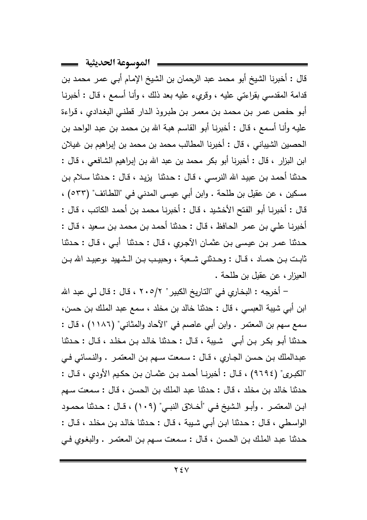 قال: أخبرنا الشيخ أبو محمد عبد الرحمان بن الشيخ الإمام أبي عمر محمد بن قدامة المقدسي بقراءتي عليه، وقريء عليه بعد ذلك، وأنا أسمع، قال: أخبرنا أبو حفص عمر بن محمد بن معمر بن طبروذ الدارقطني البغدادي، قراءة عليه وأنا أسمع، قال: أخبرنا أبو القاسم هبة الله بن محمد بن عبد الواحد بن الحصين الشيباني، قال: أخبرنا المطالب محمد بن محمد بن إبراهيم بن غيلان بن البزار، قال: أخبرنا أبو بكر محمد بن عبد الله بن إبراهيم الشافعي، قال: حدثنا أحمد بن عبيد الله النرسي، قال: حدثنا يزيد، قال: حدثنا سلام بن مسكين، عن عقيل بن طلحة. وابن أبي عيسى المدني في "اللطائف" (٥٣٣)، قال: أخبرنا أبو الفتح الأخشيد، قال: أخبرنا محمد بن أحمد الكاتب، قال: أخبرنا علي بن عمر الحافظ، قال: حدثنا أحمد بن محمد بن سعيد، قال: حدثنا عمر بن عيسى بن عثمان الآجري، قال: حدثنا أبي، قال: حدثنا ثابت بن حماد، قال: وحدثني شعبة، وحبيب بن الشهيد، وعبيد الله بن العيزار، عن عقيل بن طلحة.