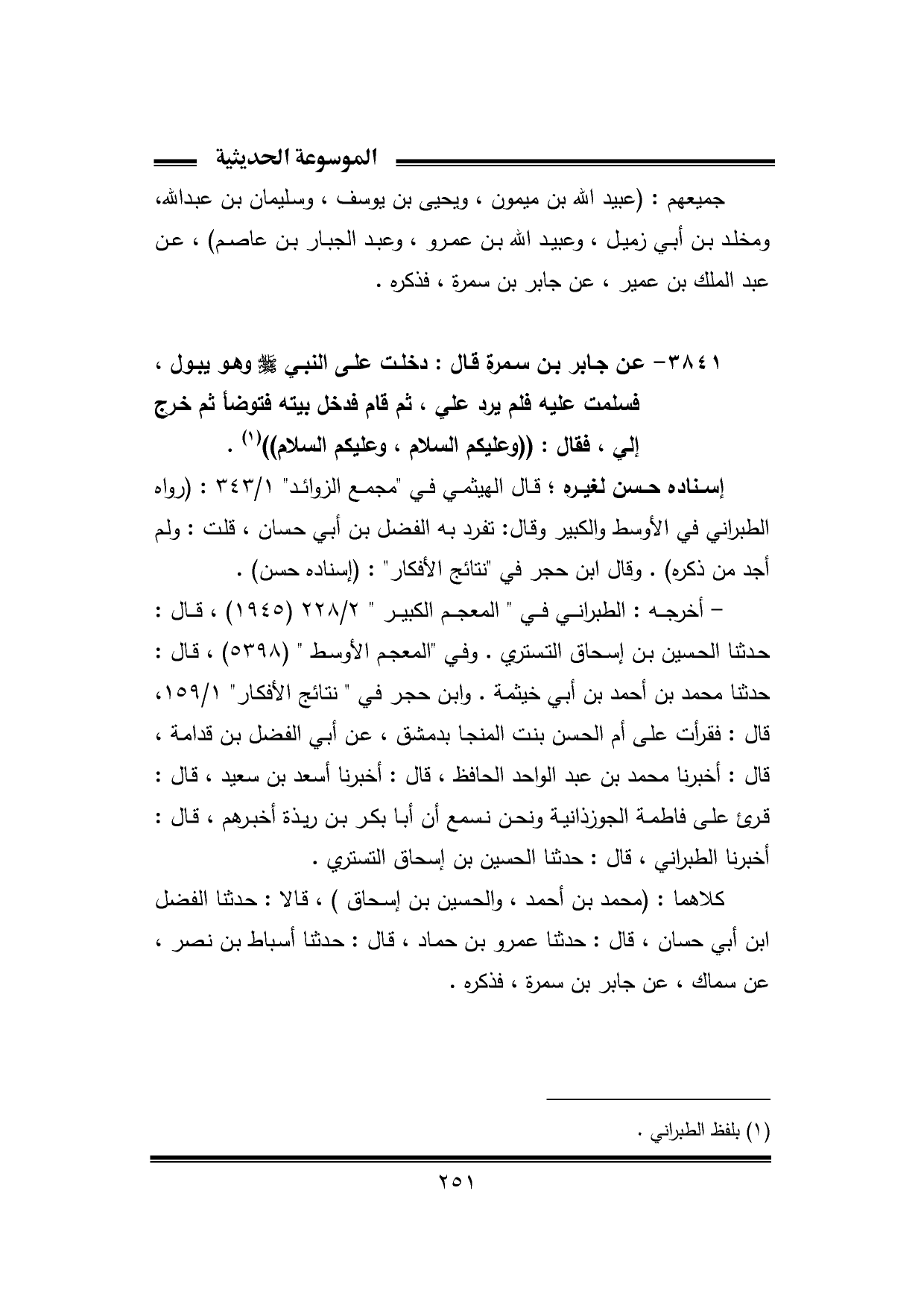 ٣٨٤١ - عن جابر بن سمرة قال: دخلت على النبي - صلى الله عليه وسلم - وهو يبول، فسلمت عليه فلم يرد علي، ثم قام فدخل بيته فتوضأ ثم خرج إلي، فقال: "وعليكم السلام، وعليكم السلام" (¬١).