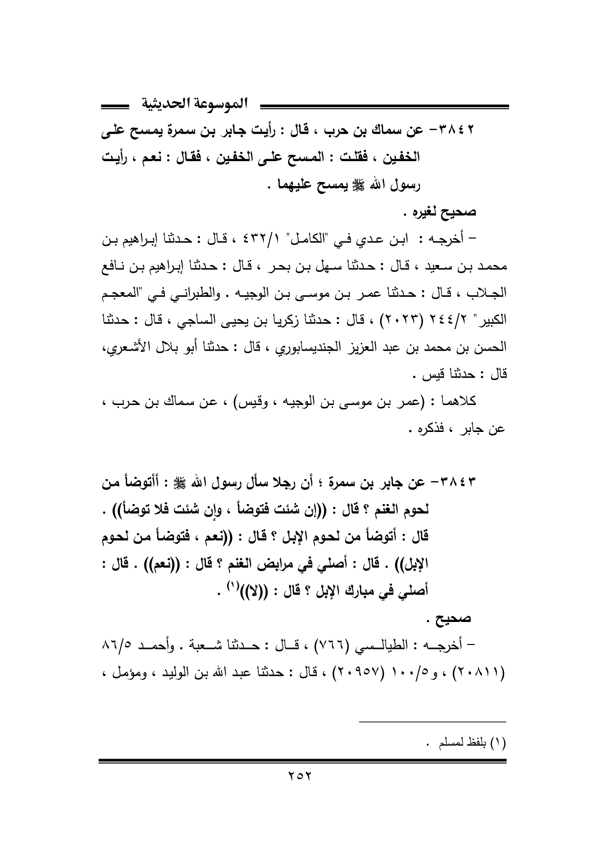 ٣٨٤٢ - عن سماك بن حرب، قال: رأيت جابر بن سمرة يمسح على الخفين، فقلت: المسح على الخفين، فقال: نعم، رأيت رسول الله - صلى الله عليه وسلم - يمسح عليهما.
