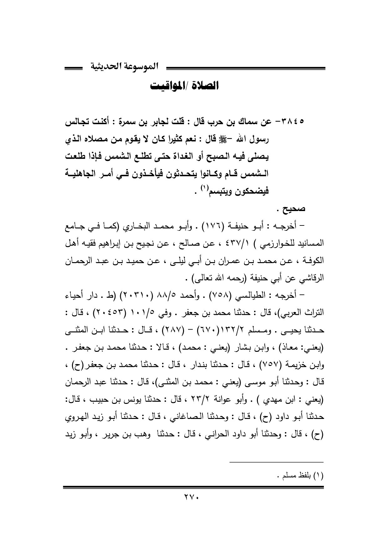 ٣٨٤٥ - عن سماك بن حرب قال: قلت لجابر بن سمرة: أكنت تجالس رسول الله -صلى الله عليه وسلم- قال: نعم كثيرا كان لا يقوم من مصلاه الذي يصلى فيه الصبح أو الغداة حتى تطلع الشمس فإذا طلعت الشمس قام وكانوا يتحدثون فيأخذون في أمر الجاهلية فيضحكون ويتبسم (¬١).