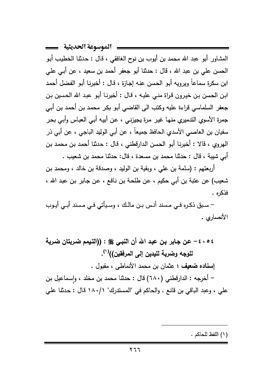 المشاور أبو عبد اللَّه محمد بن أيوب بن نوح الغافقي، قال: حدثنا الخطيب أبو الحسن علي بن عبد اللَّه، قال: حدثنا أبو جعفر أحمد بن سعيد، عن أبي علي ابن سكرة سماعًا ويرويه أبو الحسن عنه إجازة، قال: أخبرنا أبو الفضل أحمد ابن الحسن بن خيرون قراة مني عليه، قال: أخبرنا أبو عبد اللَّه الحسين بن جعفر السلماسي قراءة عليه وكتب إلى القاضي أبو بكر محمد بن أحمد بن أبي جمرة الأسوي التدميري منها غير مرة يجيزني، عن أبيه أبي العباس وأبي بحر سفيان بن العاصي الأسدي الحافظ جميعًا، عن أبي الوليد الباجي، عن أبي ذر الهروي، قالا: أخبرنا أبو الحسن الدارقطني، قال: حدثنا أحمد بن محمد بن أبي شيبة، قال: حدثنا محمد بن مسعدة، قال: حدثنا محمد بن شعيب.