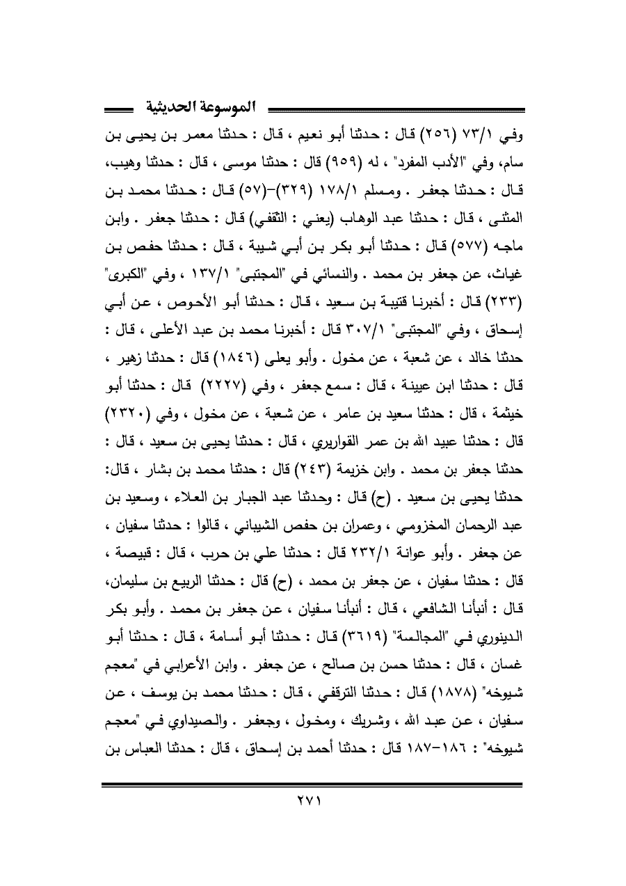 وفي ١/ ٧٣ (٢٥٦) قال: حدثنا أبو نعيم، قال: حدثنا معمر بن يحيى بن سام، وفي "الأدب المفرد"، له (٩٥٩) قال: حدثنا موسى، قال: حدثنا وهيب، قال: حدثنا جعفر. ومسلم ١/ ١٧٨ (٣٢٩) - (٥٧) قال: حدثنا محمد بن المثنى، قال: حدثنا عبد الوهاب (يعني: الثقفي) قال: حدثنا جعفر. وابن ماجه (٥٧٧) قال: حدثنا أبو بكر بن أبي شيبة، قال: حدثنا حفص بن غياث، عن جعفر بن محمد. والنسائي في "المجتبى" ١/ ١٣٧، وفي "الكبرى" (٢٣٣) قال: أخبرنا قتيبة بن سعيد، قال: حدثنا أبو الأحوص، عن أبي إسحاق، وفي "المجتبى" ١/ ٣٠٧ قال: أخبرنا محمد بن عبد الأعلى، قال: حدثنا خالد، عن شعبة، عن مخول. وأبو يعلى (١٨٤٦) قال: حدثنا زهير، قال: حدثنا ابن عيينة، قال: سمع جعفر، وفي (٢٢٢٧) قال: حدثنا أبو خيثمة، قال: حدثنا سعيد بن عامر، عن شعبة، عن مخول، وفي (٢٣٢٠) قال: حدثنا عبيد اللَّه بن عمر القواريري، قال: حدثنا يحيى بن سعيد، قال: حدثنا جعفر بن محمد. وابن خزيمة (٢٤٣) قال: حدثنا محمد بن بشار، قال: حدثنا يحيى بن سعيد. (ح) قال: وحدثنا عبد الجبار بن العلاء، وسعيد بن عبد الرحمان المخزومي، وعمران بن حفص الشيباني، قالوا: حدثنا سفيان، عن جعفر. وأبو عوانة ١/ ٢٣٢ قال: حدثنا علي بن حرب، قال: قبيصة، قال: حدثنا سفيان، عن جعفر بن محمد، (ح) قال: حدثنا الربيع بن سليمان، قال: أنبأنا الشافعي، قال: أنبأنا سفيان، عن جعفر بن محمد. وأبو بكر الدينوري في "المجالسة" (٣٦١٩) قال: حدثنا أبو أسامة، قال: حدثنا أبو غسان، قال: حدثنا حسن بن صالح، عن جعفر. وابن الأعرابي في "معجم شيوخه" (١٨٧٨) قال: حدثنا الترقفي، قال: حدثنا محمد بن يوسف، عن سفيان، عن عبد اللَّه، وشريك، ومخول، وجعفر. والصيداوي في "معجم شيوخه": ١٨٦ - ١٨٧ قال: حدثنا أحمد بن إسحاق، قال: حدثنا العباس بن