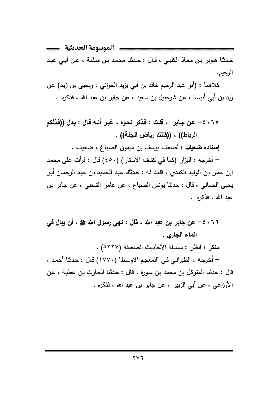 ٤٠٦٦ - عن جابر بن عبد اللَّه، قال: نهى رسول اللَّه -صلى اللَّه عليه وسلم-، أن يبال في الماء الجاري.
