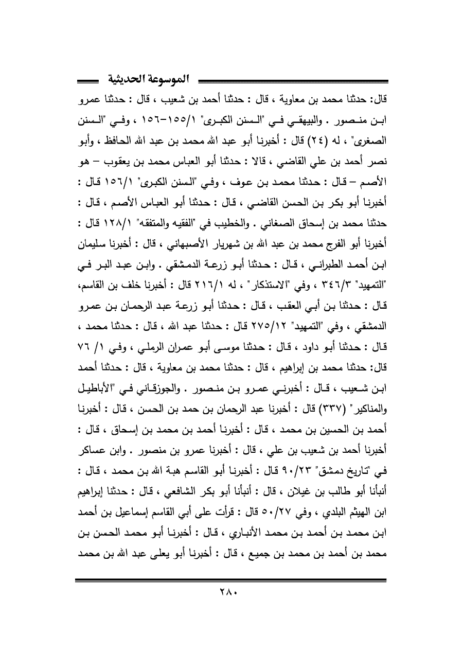 قال: حدثنا محمد بن معاوية، قال: حدثنا أحمد بن شعيب، قال: حدثنا عمرو ابن منصور. والبيهقي في "السنن الكبرى" ١/ ١٥٥ - ١٥٦، وفي "السنن الصغرى"، له (٢٤) قال: أخبرنا أبو عبد اللَّه محمد بن عبد اللَّه الحافظ، وأبو نصر أحمد بن علي القاضي، قالا: حدثنا أبو العباس محمد بن يعقوب -هو الأصم- قال: حدثنا محمد بن عوف، وفي "السنن الكبرى" ١/ ١٥٦ قال: أخبرنا أبو بكر بن الحسن القاضي، قال: حدثنا أبو العباس الأصم، قال: حدثنا محمد بن إسحاق الصغاني. والخطيب في "الفقيه والمتفقه" ١/ ١٢٨ قال: أخبرنا أبو الفرج محمد بن عبد اللَّه بن شهريار الأصبهاني، قال: أخبرنا سليمان ابن أحمد الطبراني، قال: حدثنا أبو زرعة الدمشقي. وابن عبد البر في "التمهيد" ٣/ ٣٤٦، وفي "الاستذكار"، له ١/ ٢١٦ قال: أخبرنا خلف بن القاسم، قال: حدثنا بن أبي العقب، قال: حدثنا أبو زرعة عبد الرحمان بن عمرو الدمشقي، وفي "التمهيد" ١٢/ ٢٧٥ قال: حدثنا عبد اللَّه، قال: حدثنا محمد، قال: حدثنا أبو داود، قال: حدثنا موسى أبو عمران الرملي، وفي ١/ ٧٦ قال: حدثنا محمد بن إبراهيم، قال: حدثنا محمد بن معاوية، قال: حدثنا أحمد ابن شعيب، قال: أخبرني عمرو بن منصور. والجوزقاني في "الأباطيل والمناكير" (٣٣٧) قال: أخبرنا عبد الرحمان بن حمد بن الحسن، قال: أخبرنا أحمد بن الحسين بن محمد، قال: أخبرنا أحمد بن محمد بن إسحاق، قال: أخبرنا أحمد بن شعيب بن علي، قال: أخبرنا عمرو بن منصور. وابن عساكر في "تاريخ دمشق" ٢٣/ ٩٠ قال: أخبرنا أبو القاسم هبة اللَّه بن محمد، قال: أنبأنا أبو طالب بن غيلان، قال: أنبأنا أبو بكر الشافعي، قال: حدثنا إبراهيم ابن الهيثم البلدي، وفي ٢٧/ ٥٠ قال: قرأت على أبي القاسم إسماعيل بن أحمد ابن محمد بن أحمد بن محمد الأنباري، قال: أخبرنا أبو محمد الحسن بن محمد بن أحمد بن محمد بن جميع، قال: أخبرنا أبو يعلى عبد اللَّه بن محمد