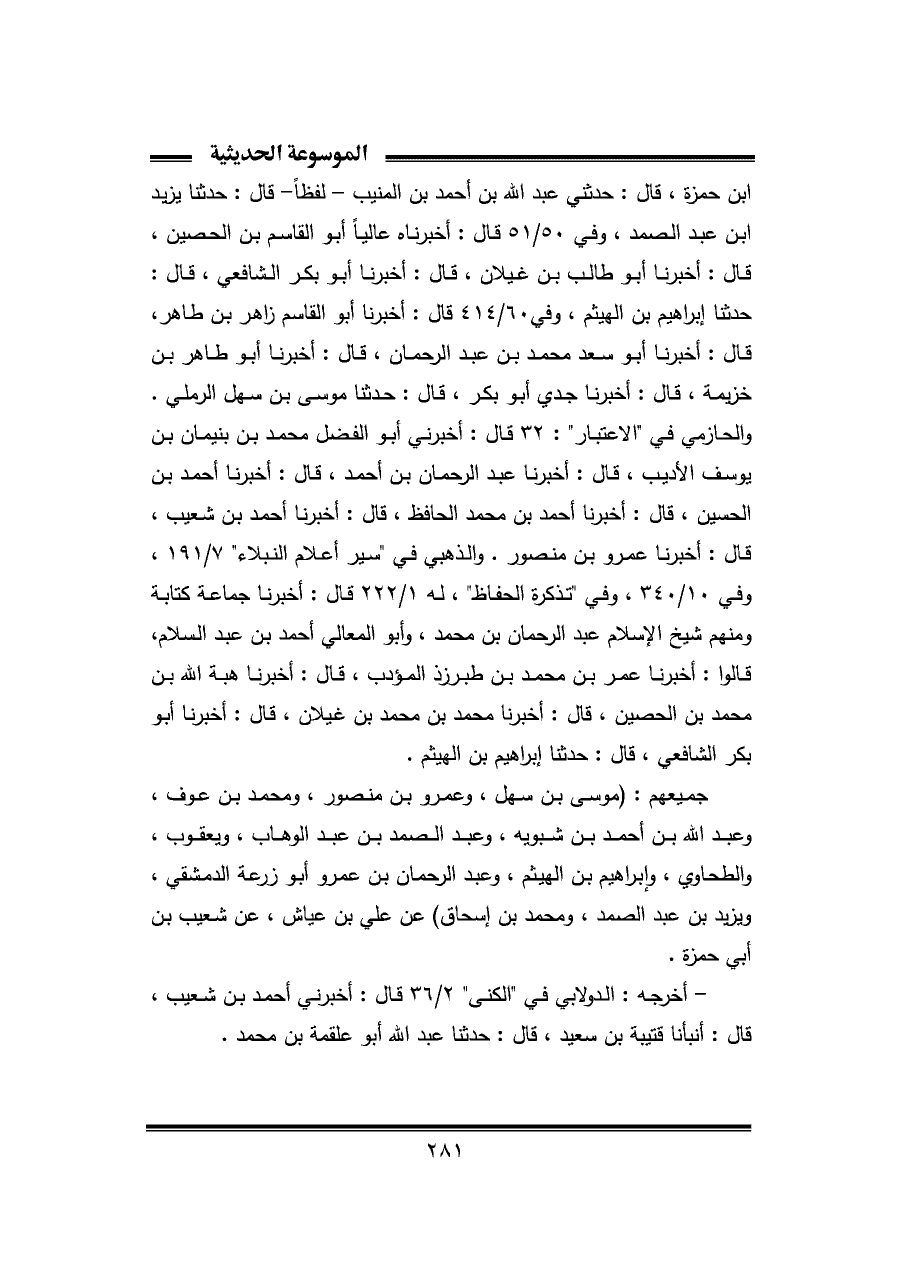 ابن حمزة، قال: حدثني عبد اللَّه بن أحمد بن المنيب -لفظًا- قال: حدثنا يزيد ابن عبد الصمد، وفي ٥٠/ ٥١ قال: أخبرناه عاليًا أبو القاسم بن الحصين، قال: أخبرنا أبو طالب بن غيلان، قال: أخبرنا أبو بكر الشافعي، قال: حدثنا إبراهيم بن الهيثم، وفي ٦٠/ ٤١٤ قال: أخبرنا أبو القاسم زاهر بن طاهر، قال: أخبرنا أبو سعد محمد بن عبد الرحمان، قال: أخبرنا أبو طاهر بن خزيمة، قال: أخبرنا جدي أبو بكر، قال: حدثنا موسى بن سهل الرملي. والحازمي في "الاعتبار": ٣٢ قال: أخبرني أبو الفضل محمد بن بنيمان بن يوسف الأديب، قال: أخبرنا عبد الرحمان بن أحمد، قال: أخبرنا أحمد بن الحسين، قال: أخبرنا أحمد بن محمد الحافظ، قال: أخبرنا أحمد بن شعيب، قال: أخبرنا عمرو بن منصور. والذهبي في "سير أعلام النبلاء" ٧/ ١٩١، وفي ١٠/ ٣٤٠، وفي "تذكرة الحفاظ"، له ١/ ٢٢٢ قال: أخبرنا جماعة كتابة ومنهم شيخ الإسلام عبد الرحمان بن محمد، وأبو المعالي أحمد بن عبد السلام، قالوا: أخبرنا عمر بن محمد بن طبرزذ المؤدب، قال: أخبرنا هبة اللَّه بن محمد بن الحصين، قال: أخبرنا محمد بن محمد بن غيلان، قال: أخبرنا أبو بكر الشافعي، قال: حدثنا إبراهيم بن الهيثم.