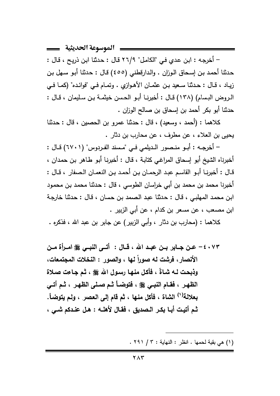 ٤٠٧٣ - عن جابر بن عبد اللَّه، قال: أتى النبي -صلى اللَّه عليه وسلم- امرأة من الأنصار، فرشت له صورًا لها، والصور: النخلات المجتمعات، وذبحت له شاةً، فأكل منها رسول اللَّه -صلى اللَّه عليه وسلم-، ثم جاءت صلاة الظهر، فقام النبي -صلى اللَّه عليه وسلم-، فتوضأ ثم صلى الظهر، ثم أتي بعلالة (¬١) الشاة، فأكل منها، ثم قام إلى العصر، ولم يتوضأ. ثم أتيت أبا بكر الصديق، فقال لأهله: هل عندكم شيء،