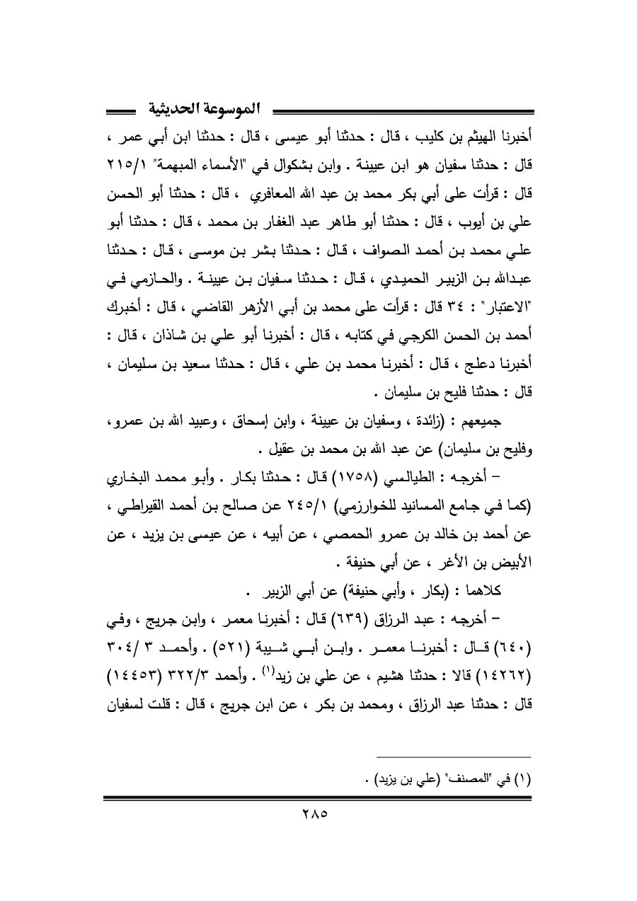 أخبرنا الهيثم بن كليب، قال: حدثنا أبو عيسى، قال: حدثنا ابن أبي عمر، قال: حدثنا سفيان هو ابن عيينة. وابن بشكوال في "الأسماء المبهمة" ١/ ٢١٥ قال: قرأت على أبي بكر محمد بن عبد اللَّه المعافري، قال: حدثنا أبو الحسن علي بن أيوب، قال: حدثنا أبو طاهر عبد الغفار بن محمد، قال: حدثنا أبو علي محمد بن أحمد الصواف، قال: حدثنا بشر بن موسى، قال: حدثنا عبد اللَّه بن الزبير الحميدي، قال: حدثنا سفيان بن عيينة. والحازمي في "الاعتبار": ٣٤ قال: قرأت على محمد بن أبي الأزهر القاضي، قال: أخبرك أحمد بن الحسن الكرجي في كتابه، قال: أخبرنا أبو علي بن شاذان، قال: أخبرنا دعلج، قال: أخبرنا محمد بن علي، قال: حدثنا سعيد بن سليمان، قال: حدثنا فليح بن سليمان.
