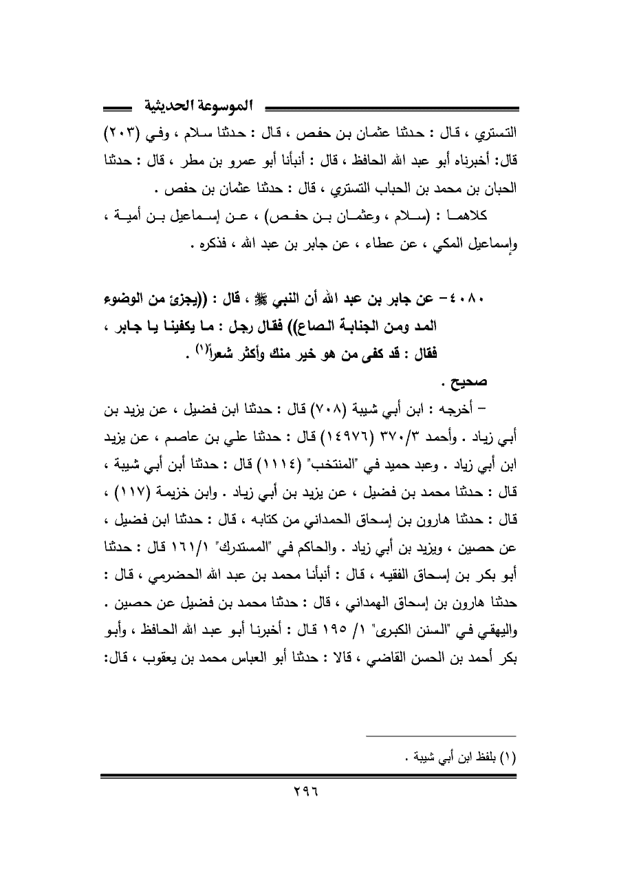 ٤٠٨٠ - عن جابر بن عبد اللَّه أن النبي -صلى اللَّه عليه وسلم-، قال: "يجزئ من الوضوء المد ومن الجنابة الصاع" فقال رجل: ما يكفينا يا جابر، فقال: قد كفى من هو خير منك وأكثر شعرًا (¬١).
