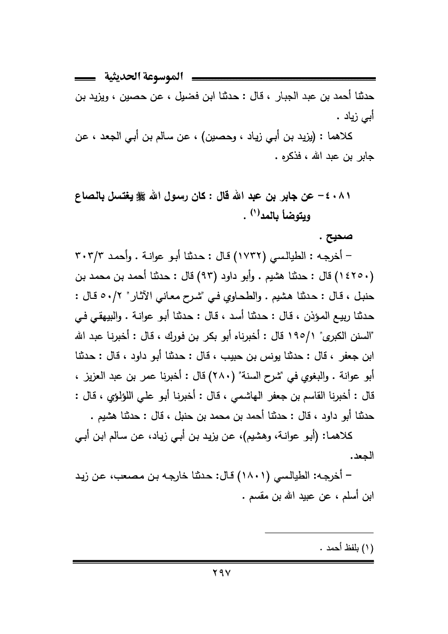 ٤٠٨١ - عن جابر بن عبد اللَّه قال: كان رسول اللَّه -صلى اللَّه عليه وسلم- يغتسل بالصاع ويتوضأ بالمد (¬١).
