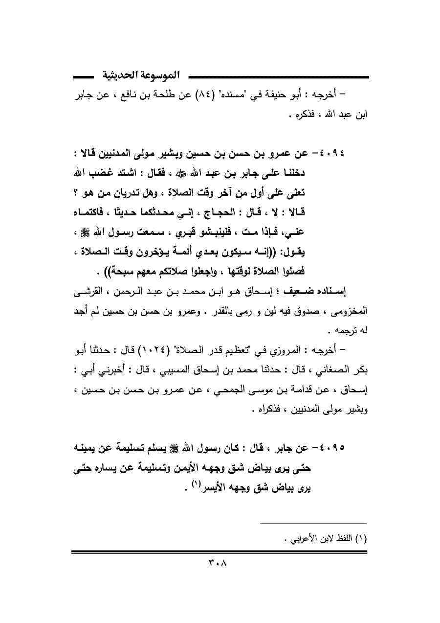 ٤٠٩٤ - عن عمرو بن حسن بن حسين وبشير مولى المدنيين قالا: دخلنا على جابر بن عبد اللَّه -رضي اللَّه عنه-، فقال: اشتد غضب اللَّه تعلى على أول من آخر وقت الصلاة، وهل تدريان من هو؟ قالا: لا، قال: الحجاج، إني محدثكما حديثا، فاكتماه عني، فإذا مت، فلينبشو قبري، سمعت رسول اللَّه -صلى اللَّه عليه وسلم-، يقول: "إنه سيكون بعدي أئمة يؤخرون وقت الصلاة، فصلوا الصلاة لوقتها، واجعلوا صلاتكم معهم سبحة".