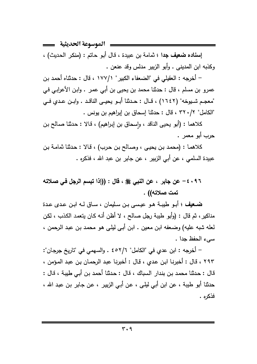 ٤٠٩٦ - عن جابر، عن النبي -صلى اللَّه عليه وسلم-، قال: "إذا تبسم الرجل في صلاته تمت صلاته".