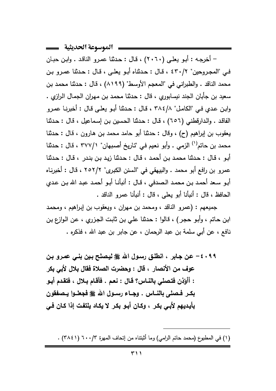 ٤٠٩٩ - عن جابر، انطلق رسول اللَّه -صلى اللَّه عليه وسلم- ليصلح بين بني عمرو بن عوف من الأنصار، قال: وحضرت الصلاة فقال بلال لأبي بكر: أأؤذن فصلي بالناس؟ قال: نعم. فأقام بلال، فتقدم أبو بكر فصلى بالناس. وجاء رسول اللَّه -صلى اللَّه عليه وسلم- فجعلوا يصفقون بأيديهم لأبي بكر، وكان أبو بكر لا يكاد يلتفت إذا كان في