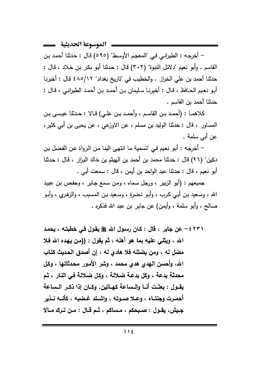 ٤٢٣١ - عن جابر، قال: كان رسول الله -صَلَّى اللهُ عَلَيْهِ وَسَلَّمَ- يقول في خطبته، يحمد الله، ويثني عليه بما هو أهله، ثم يقول: ((من يهده الله فلا مضل له، ومن يضلله فلا هادي له، إن أصدق الحديث كتاب الله، وأحسن الهدي هدي محمد، وشر الأمور محدثاتها، وكل محدثة بدعة، وكل بدعة ضلالة، وكل ضلالة في النار، ثم يقول: بعثت أنا والساعة كهاتين. وكان إذا ذكر الساعة أحمرت وجنتاه، وعلا صوته، واشتد غضبه، كأنه نذير جيش، يقول: صبحكم، مساكم، ثم قال: من ترك مالا