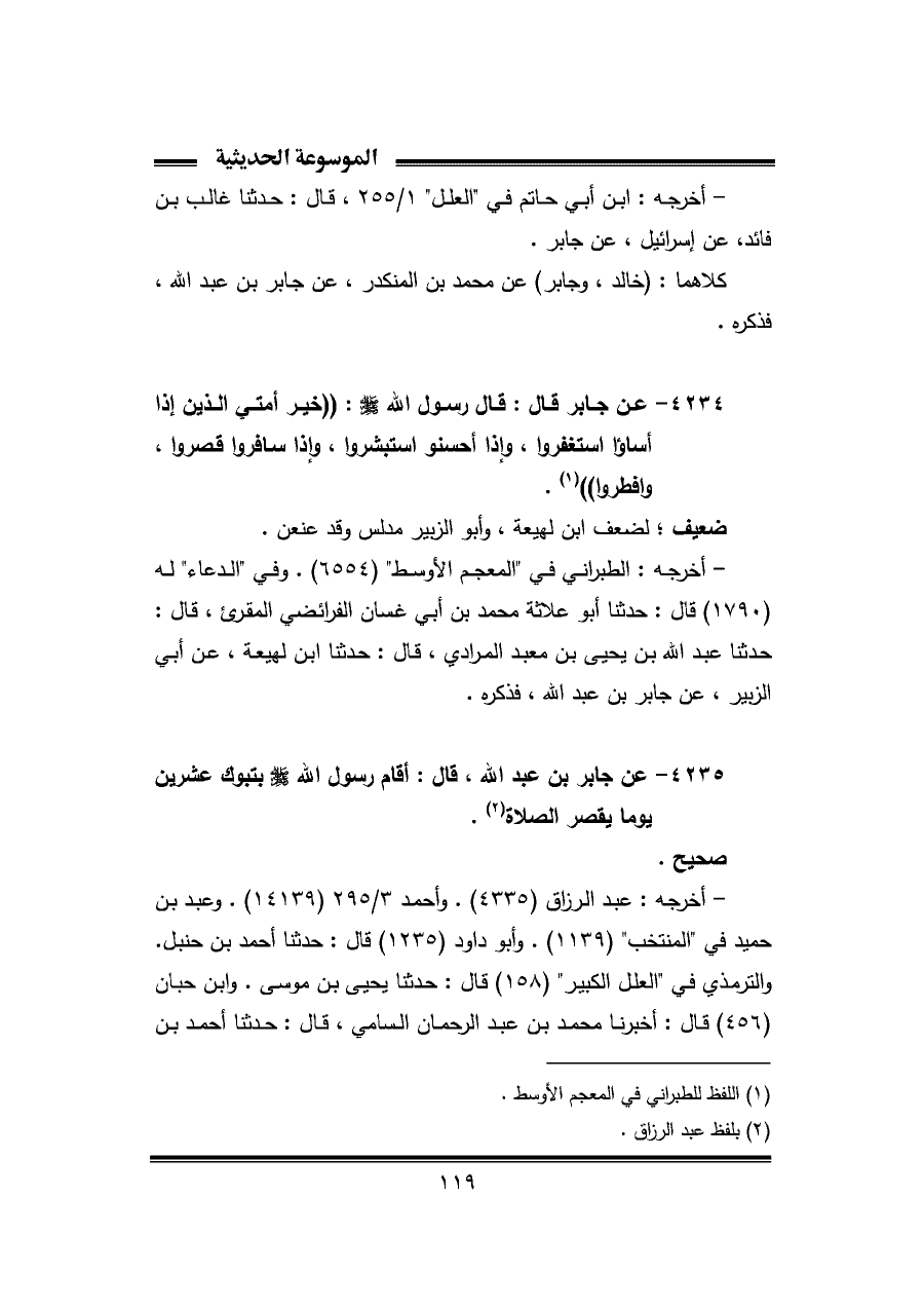 ٤٢٣٤ - عن جابر قال: قال رسول الله -صَلَّى اللهُ عَلَيْهِ وَسَلَّمَ-: ((خير أمتي الذين إذا أساؤا استغفروا، وإذا أحسنو استبشروا، وإذا سافروا قصروا، وافطروا)) (¬١).