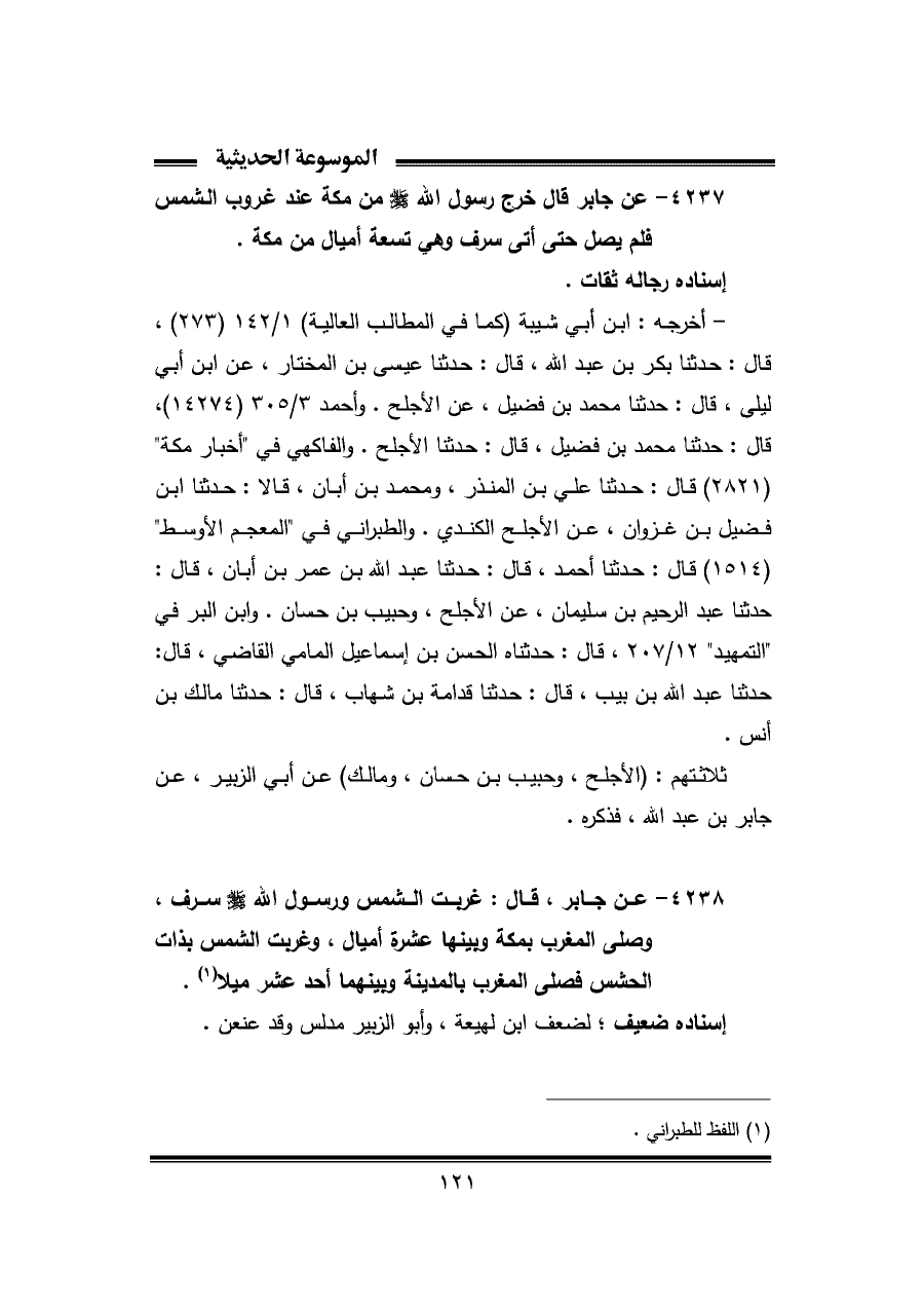 ٤٢٣٨ - عن جابر، قال: غربت الشمس ورسول الله -صَلَّى اللهُ عَلَيْهِ وَسَلَّمَ- سرف، وصلى المغرب بمكة وبينها عشرة أميال، وغربت الشمس بذات الحشس فصلى المغرب بالمدينة وبينهما أحد عشر ميلا (¬١).