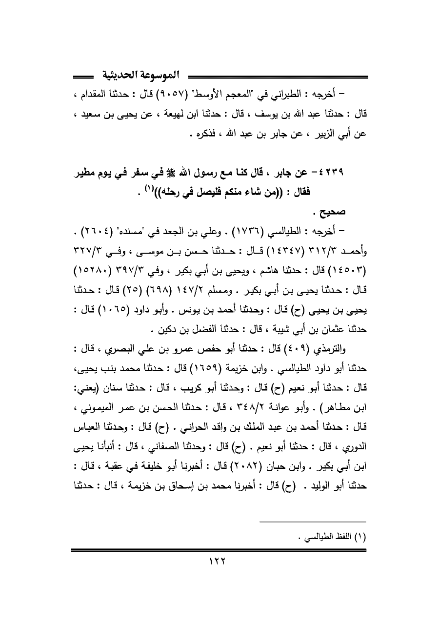 ٤٢٣٩ - عن جابر، قال كنا مع رسول الله -صَلَّى اللهُ عَلَيْهِ وَسَلَّمَ- في سفر في يوم مطير فقال: ((من شاء منكم فليصل في رحله)) (¬١).