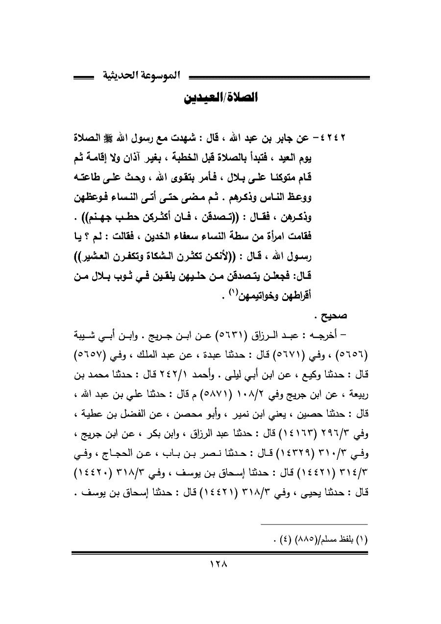 ٤٢٤٢ - عن جابر بن عبد الله، قال: شهدت مع رسول الله -صَلَّى اللهُ عَلَيْهِ وَسَلَّمَ- الصلاة يوم العيد، فتبدأ بالصلاة قبل الخطبة، بغير آذان ولا إقامة ثم قام متوكئا على بلال، فأمر بتقوى الله، وحث على طاعته ووعظ الناس وذكرهم. ثم مضى حتى أتى النساء فوعظهن وذكرهن، فقال: ((تصدقن، فإن أكثركن حطب جهنم)). فقامت امرأة من سطة النساء سعفاء الخدين، فقالت: لم؟ يا رسول الله، قال: ((لأنكن تكثرن الشكاة وتكفرن العشير)) قال: فجعلن يتصدقن من حليهن يلقين في ثوب بلال من أقراطهن وخواتيمهن (¬١).