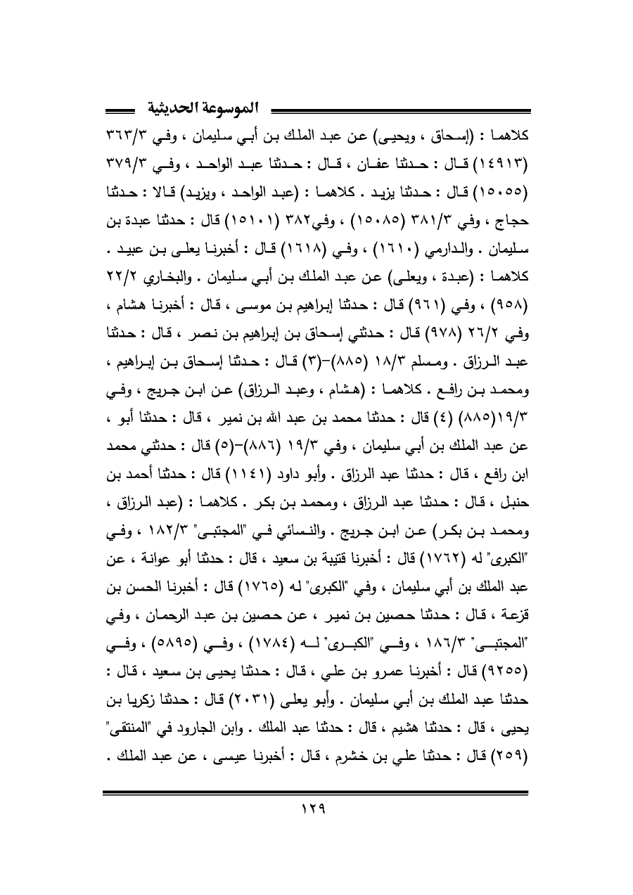 كلاهما: (إسحاق، ويحيى) عن عبد الملك بن أبي سليمان، وفي ٣/ ٣٦٣ (١٤٩١٣) قال: حدثنا عفان، قال: حدثنا عبد الواحد، وفي ٣/ ٣٧٩ (١٥٠٥٥) قال: حدثنا يزيد. كلاهما: (عبد الواحد، ويزيد) قالا: حدثنا حجاج، وفي ٣/ ٣٨١ (١٥٠٨٥)، وفي ٣٨٢ (١٥١٠١) قال: حدثنا عبدة بن سليمان. والدارمي (١٦١٠)، وفي (١٦١٨) قال: أخبرنا يعلى بن عبيد. كلاهما: (عبدة، ويعلى) عن عبد الملك بن أبي سليمان. والبخاري ٢/ ٢٢ (٩٥٨)، وفي (٩٦١) قال: حدثنا إبراهيم بن موسى، قال: أخبرنا هشام، وفي ٢/ ٢٦ (٩٧٨) قال: حدثني إسحاق بن إبراهيم بن نصر، قال: حدثنا عبد الرزاق. ومسلم ٣/ ١٨ (٨٨٥) - (٣) قال: حدثنا إسحاق بن إبراهيم، ومحمد بن رافع. كلاهما: (هشام، وعبد الرزاق) عن ابن جريج، وفي ٣/ ١٩ (٨٨٥) (٤) قال: حدثنا محمد بن عبد الله بن نمير، قال: حدثنا أبو، عن عبد الملك بن أبي سليمان، وفي ٣/ ١٩ (٨٨٦) - (٥) قال: حدثني محمد ابن رافع، قال: حدثنا عبد الرزاق. وأبو داود (١١٤١) قال: حدثنا أحمد بن حنبل، قال: حدثنا عبد الرزاق، ومحمد بن بكر. كلاهما: (عبد الرزاق، ومحمد بن بكر) عن ابن جريج. والنسائي في "المجتبى" ٣/ ١٨٢، وفي "الكبرى" له (١٧٦٢) قال: أخبرنا قتيبة بن سعيد، قال: حدثنا أبو عوانة، عن عبد الملك بن أبي سليمان، وفي "الكبرى" له (١٧٦٥) قال: أخبرنا الحسن بن قزعة، قال: حدثنا حصين بن نمير، عن حصين بن عبد الرحمان، وفي "المجتبى" ٣/ ١٨٦، وفي "الكبرى" له (١٧٨٤)، وفي (٥٨٩٥)، وفي (٩٢٥٥) قال: أخبرنا عمرو بن علي، قال: حدثنا يحيى بن سعيد، قال: حدثنا عبد الملك بن أبي سليمان. وأبو يعلى (٢٠٣١) قال: حدثنا زكريا بن يحيى، قال: حدثنا هشيم، قال: حدثنا عبد الملك. وابن الجارود في "المنتقى" (٢٥٩) قال: حدثنا علي بن خشرم، قال: أخبرنا عيسى، عن عبد الملك.