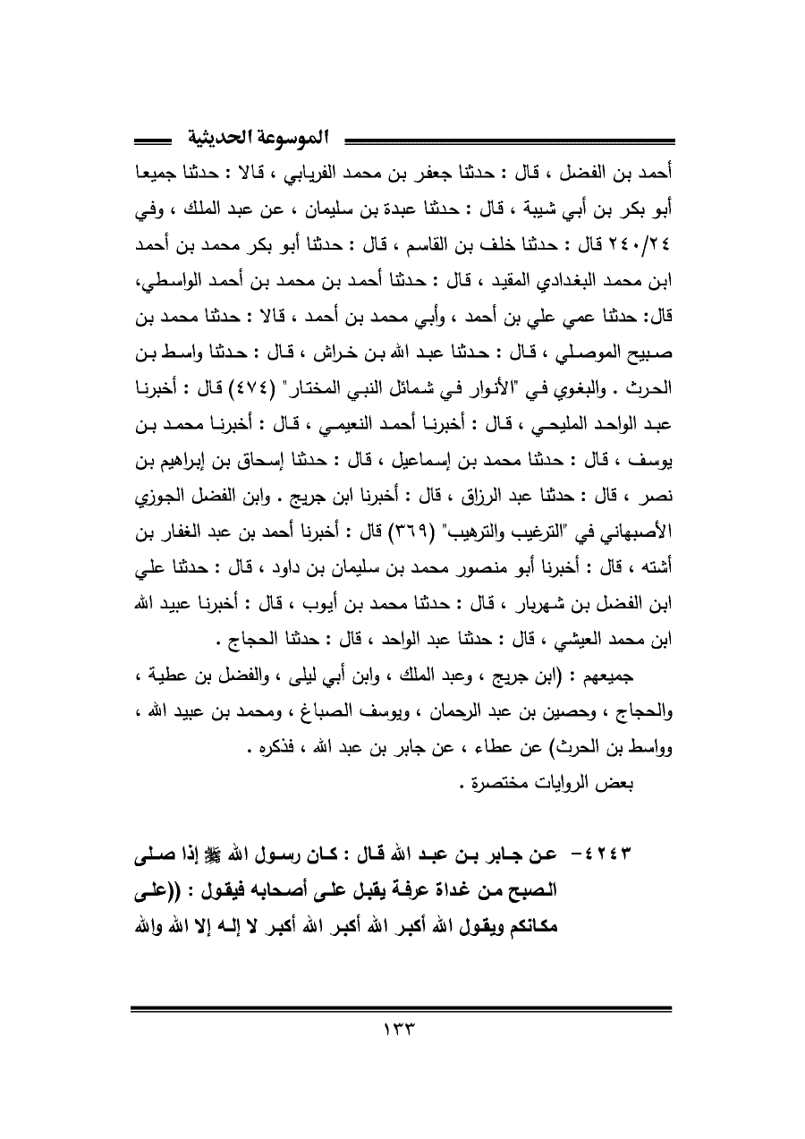 ٤٢٤٣ - عن جابر بن عبد الله قال: كان رسول الله - صلى الله عليه وسلم - إذا صلى الصبح من غداة عرفة يقبل على أصحابه فيقول: "على مكانكم ويقول الله أكبر الله أكبر الله أكبر لا إله إلا الله والله