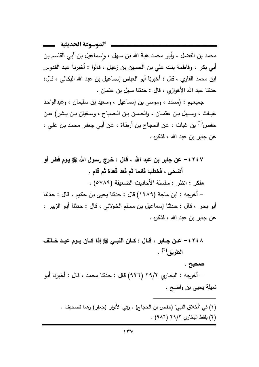 جميعهم: (مسدد، وموسى بن إسماعيل، وسعيد بن سليمان، وعبد الواحد غياث، وسهل بن عثمان، والحسن بن الصباح، وسفيان بن بشر) عن حفص (¬١) بن غياث، عن الحجاج بن أرطأة، عن أبي جعفر محمد بن علي، عن جابر بن عبد الله، فذكره.