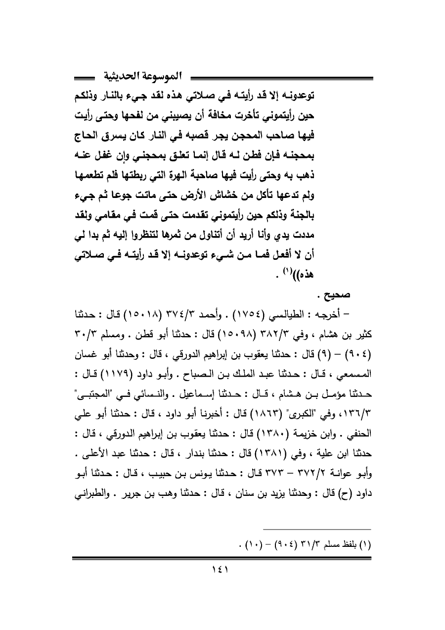 توعدونه إلا قد رأيته في صلاتي هذه لقد جيء بالنار وذلكم حين أريتموني تأخرت مخافة أن يصيبني من لفحها وحتى رأيت فيها صاحب المحجن يجر قصبه في النار كان يسرق الحاج بمحجنه فإن فطن له قال إنما تعلق بمحجني وإن غفل عنه ذهب به وحتى رأيت فيها صاحبة الهرة التي ربطتها فلم تطعمها ولم تدعها تأكل من خشاش الأرض حتى ماتت جوعا ثم جيء بالجنة وذلكم حين رأيتموني تقدمت حتى قمت في مقامي ولقد مددت يدي وأنا أريد أن أتناول من ثمرها لتنظروا إليه ثم بدا لي أن لا أفعل فما من شيء توعدونه إلا قد رأيته في صلاتي هذه" (¬١).