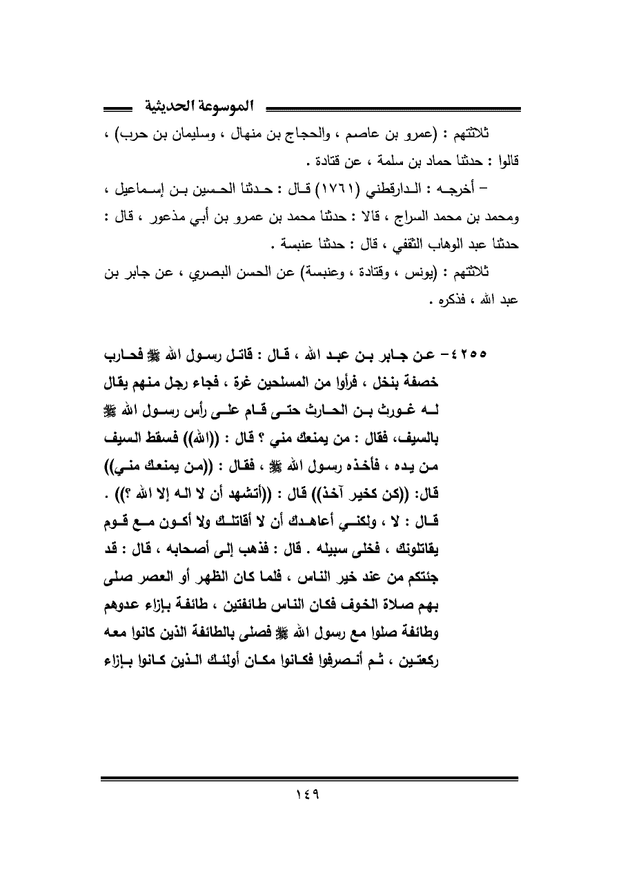 ٤٢٥٥ - عن جابر بن عبد الله، قال: قاتل رسول الله - صلى الله عليه وسلم - فحارب خصفة بنخل، فرأوا من المسلحين غرة، فجاء رجل منهم يقال له غورث بن الحارث حتى قام على رأس رسول الله - صلى الله عليه وسلم - بالسيف، فقال: من يمنعك مني؟ قال: "الله" فسقط السيف من يده، فأخذه رسول الله - صلى الله عليه وسلم -، فقال: "من يمنعك مني" قال: "ركن كخير آخذ" قال: "أتشهد أن لا إله إلا الله؟ ". قال: لا، ولكني أعاهدك أن لا أقاتلك ولا أكون مع قوم يقاتلونك، فخلى سبيله. قال: فذهب إلى أصحابه، قال: قد جئتكم من عند خير الناس، فلما كان الظهر أو العصر صلى بهم صلاة الخوف فكان الناس طائفتين، طائفة بإزاء عدوهم وطائفة صلوا مع رسول الله - صلى الله عليه وسلم - فصلى بالطائفة الذين كانوا معه ركعتين، ثم انصرفوا فكانوا مكان أولئك الذين كانوا بإزاء