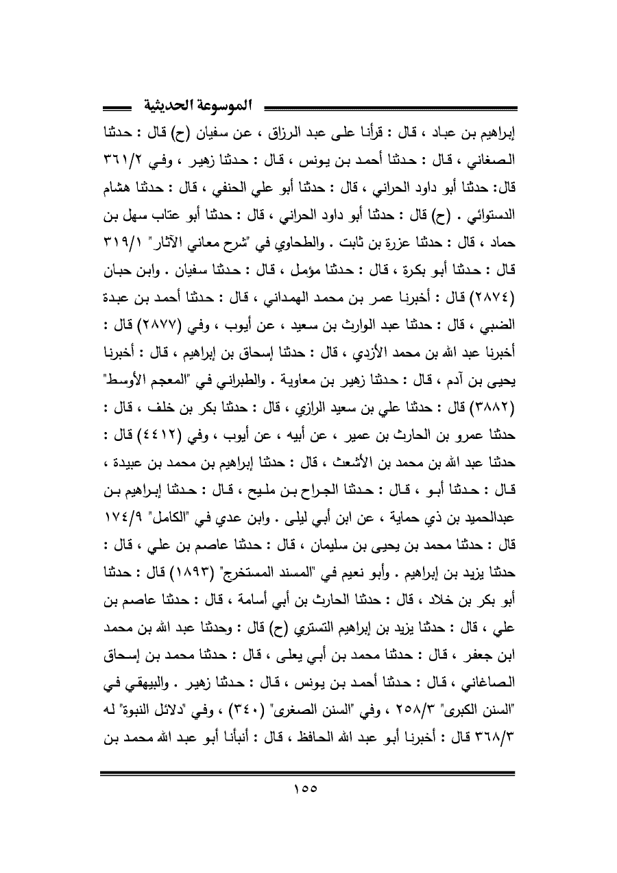 إبراهيم بن عباد، قال: قرأنا على عبد الرزاق، عن سفيان (ح) قال: حدثنا الصغاني، قال: حدثنا أحمد بن يونس، قال: حدثنا زهير، وفي ٢/ ٣٦١ قال: حدثنا أبو داود الحراني، قال: حدثنا أبو علي الحنفي، قال: حدثنا هشام الدستوائي. (ح) قال: حدثنا أبو داود الحراني، قال: حدثنا أبو عتاب سهل بن حماد، قال: حدثنا عزرة بن ثابت. والطحاوي في "شرح معاني الآثار" ١/ ٣١٩ قال: حدثنا أبو بكرة، قال: حدثنا مؤمل، قال: حدثنا سفيان. وابن حبان (٢٨٧٤) قال: أخبرنا عمر بن محمد الهمداني، قال: حدثنا أحمد بن عبدة الضبي، قال: حدثنا عبد الوارث بن سعيد، عن أيوب، وفي (٢٨٧٧) قال: أخبرنا عبد الله بن محمد الأزدي، قال: حدثنا إسحاق بن إبراهيم، قال: أخبرنا يحيى بن آدم، قال: حدثنا زهير بن معاوية. والطبراني في "المعجم الأوسط" (٣٨٨٢) قال: حدثنا علي بن سعيد الرازي، قال: حدثنا بكر بن خلف، قال: حدثنا عمرو بن الحارث بن عمير، عن أبيه، عن أيوب، وفي (٤٤١٢) قال: حدثنا عبد الله بن محمد بن الأشعث، قال: حدثنا إبراهيم بن محمد بن عبيدة، قال: حدثنا أبو، قال: حدثنا الجراح بن مليح، قال: حدثنا إبراهيم بن عبد الحميد بن ذي حماية، عن ابن أبي ليلى. وابن عدي في "الكامل" ٩/ ١٧٤ قال: حدثنا محمد بن يحيى بن سليمان، قال: حدثنا عاصم بن علي، قال: حدثنا يزيد بن إبراهيم. وأبو نعيم في "المسند المستخرج" (١٨٩٣) قال: حدثنا أبو بكر بن خلاد، قال: حدثنا الحارث بن أبي أسامة، قال: حدثنا عاصم بن علي، قال: حدثنا يزيد بن إبراهيم التستري (ح) قال: وحدثنا عبد الله بن محمد بن جعفر، قال: حدثنا محمد بن أبي يعلى، قال: حدثنا محمد بن إسحاق الصاغاني، قال: حدثنا أحمد بن يونس، قال: حدثنا زهير. والبيهقي في "السنن الكبرى" ٣/ ٢٥٨، وفي "السنن الصغرى" (، ٣٤)، وفي "دلائل النبوة" له ٣/ ٣٦٨ قال: أخبرنا أبو عبد الله الحافظ، قال: أنبأنا أبو عبد الله محمد بن