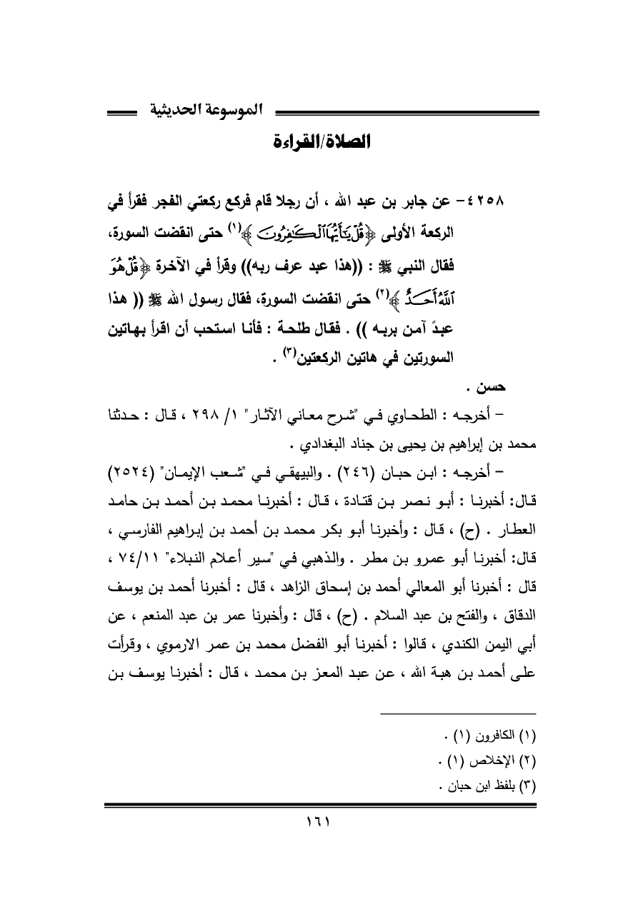 ٤٢٥٨ - عن جابر بن عبد الله، أن رجلا قام فركع ركعتي الفجر فقرأ في الركعة الأولى {قُلْ يَاأَيُّهَا الْكَافِرُونَ} (¬١) حتى انقضت السورة، فقال النبي - صلى الله عليه وسلم -: "هذا عبد عرف ربه" وقرأ في الآخرة {قُلْ هُوَ اللَّهُ أَحَدٌ} (¬٢) حتى انقضت السورة، فقال رسول الله - صلى الله عليه وسلم - "هذا عبدً آمن بربه". فقال طلحة: فأنا استحب أن اقرأ بهاتين السورتين في هاتين الركعتين (¬٣).