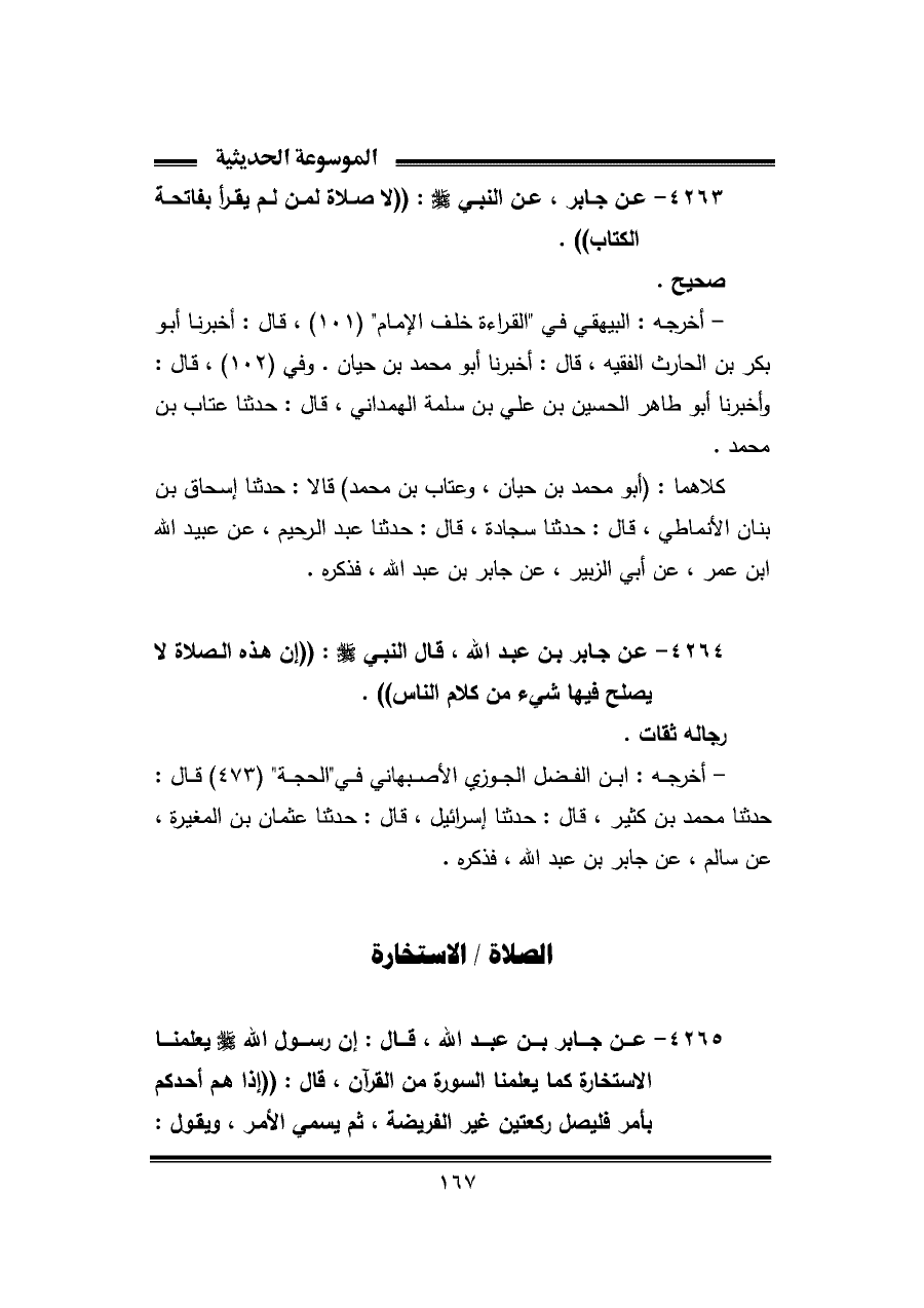 ٤٢٦٤ - عن جابر بن عبد الله، قال النبي - صلى الله عليه وسلم -: "إن هذه الصلاة لا يصلح فيها شيء من كلام الناس".