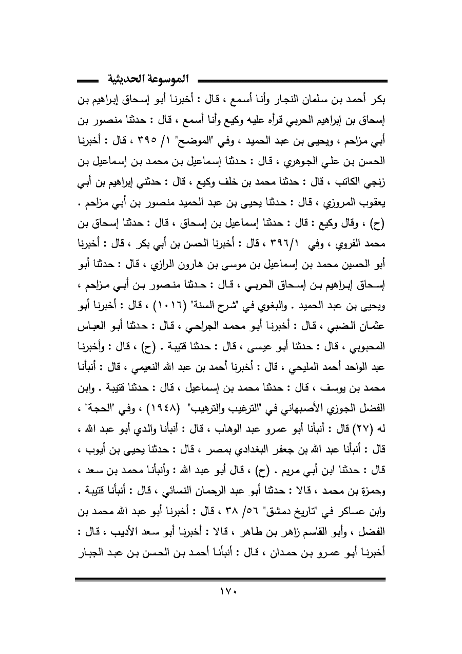 بكر أحمد بن سلمان النجار وأنا أسمع، قال: أخبرنا أبو إسحاق إبراهيم بن إسحاق بن إبراهيم الحربي قرأه عليه وكيع وأنا أسمع، قال: حدثنا منصور بن أبي مزاحم، ويحيى بن عبد الحميد، وفي "الموضح" ١/ ٣٩٥، قال: أخبرنا الحسن بن علي الجوهري، قال: حدثنا إسماعيل بن محمد بن إسماعيل بن زنجي الكاتب، قال: حدثنا محمد بن خلف وكيع، قال: حدثني إبراهيم بن أبي يعقوب المروزي، قال: حدثنا يحيى بن عبد الحميد منصور بن أبي مزاحم. (ح)، وقال وكيع: قال: حدثنا إسماعيل بن إسحاق، قال: حدثنا إسحاق بن محمد الفروي، وفي ١/ ٣٩٦، قال: أخبرنا الحسن بن أبي بكر، قال: أخبرنا أبو الحسين محمد بن إسماعيل بن موسى بن هارون الرازي، قال: حدثنا أبو إسحاق إبراهيم بن إسحاق الحربي، قال: حدثنا منصور بن أبي مزاحم، ويحيى بن عبد الحميد. والبغوي في "شرح السنة" (١٠١٦)، قال: أخبرنا أبو عثمان الضبي، قال: أخبرنا أبو محمد الجراحي، قال: حدثنا أبو العباس المحبوبي، قال: حدثنا أبو عيسى، قال: حدثنا قتيبة. (ح)، قال: وأخبرنا عبد الواحد أحمد المليحي، قال: أخبرنا أحمد بن عبد الله النعيمي، قال: أنبأنا محمد بن يوسف، قال: حدثنا محمد بن إسماعيل، قال: حدثنا قتيبة. وابن الفضل الجوزي الأصبهاني في "الترغيب والترهيب" (١٩٤٨)، وفي "الحجة"، له (٢٧) قال: أنبأنا أبو عمرو عبد الوهاب، قال: أنبأنا والدي أبو عبد الله، قال: أنبأنا عبد الله بن جعفر البغدادي بمصر، قال: حدثنا يحيى بن أيوب، قال: حدثنا ابن أبي مريم. (ح)، قال أبو عبد الله: وأنبأنا محمد بن سعد، وحمزة بن محمد، قالا: حدثنا أبو عبد الرحمان النسائي، قال: أنبأنا قتيبة. وابن عساكر في "تاريخ دمشق" ٥٦/ ٣٨، قال: أخبرنا أبو عبد الله محمد بن الفضل، وأبو القاسم زاهر بن طاهر، قالا: أخبرنا أبو سعد الأديب، قال: أخبرنا أبو عمرو بن حمدان، قال: أنبأنا أحمد بن الحسن بن عبد الجبار