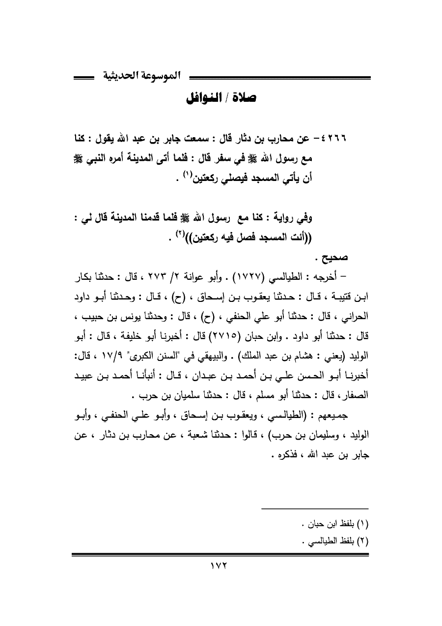 ٤٢٦٦ - عن محارب بن دثار قال: سمعت جابر بن عبد الله يقول: كنا مع رسول الله - صلى الله عليه وسلم - في سفر قال: فلما أتى المدينة أمره النبي - صلى الله عليه وسلم - أن يأتي المسجد فيصلي ركعتين (¬١).