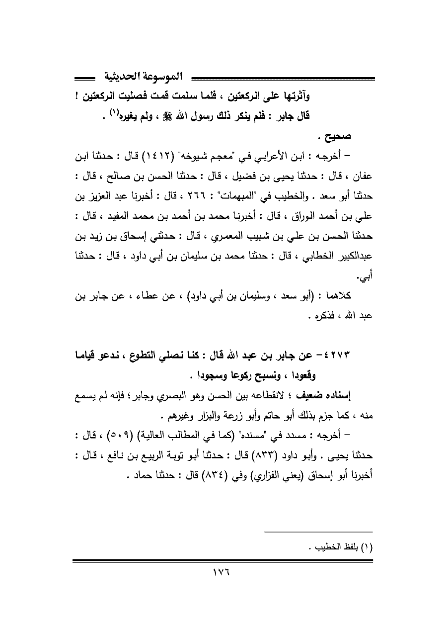 ٤٢٧٣ - عن جابر بن عبد الله قال: كنا نصلي التطوع، ندعو قياما وقعودا، ونسبح ركوعا وسجودا.